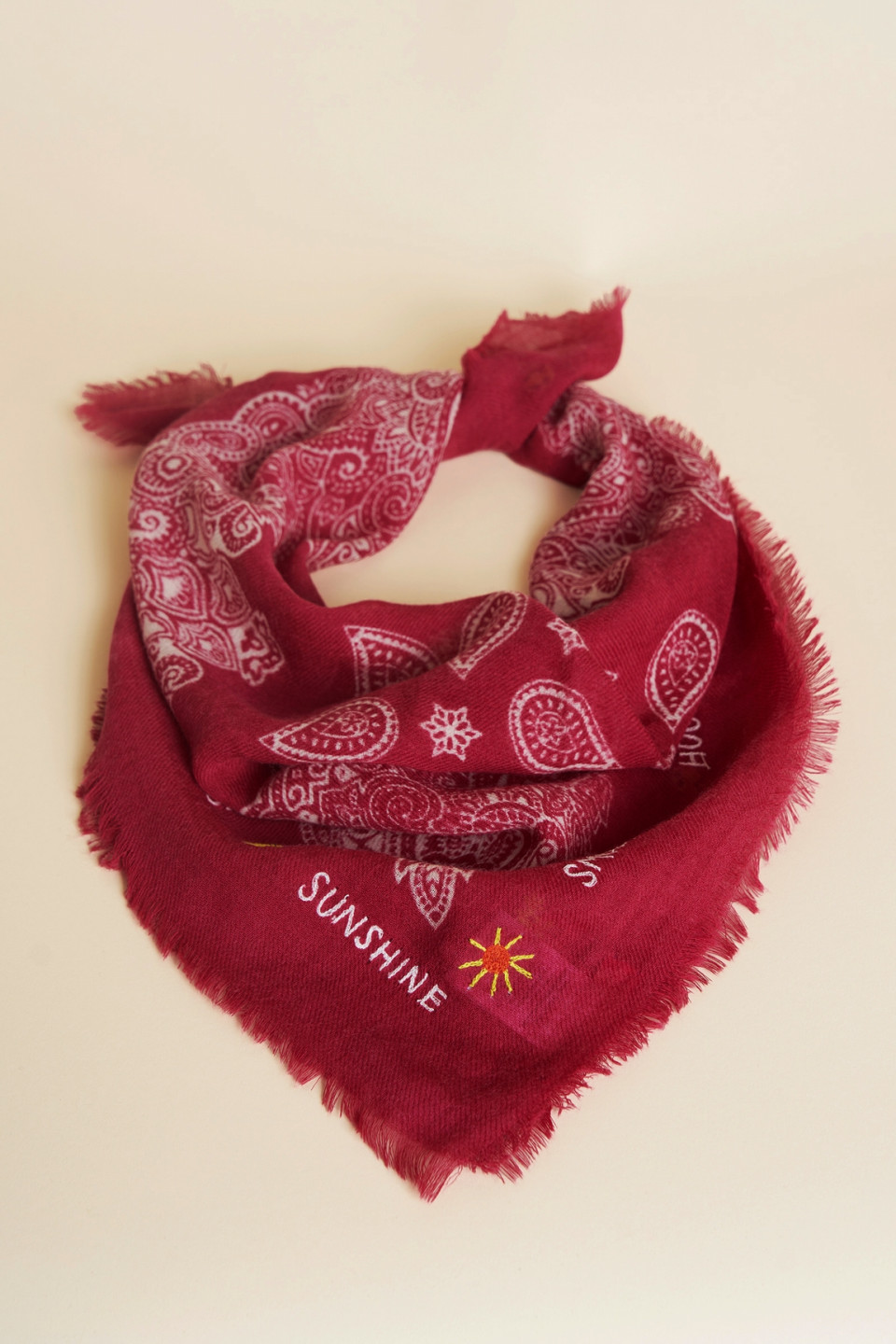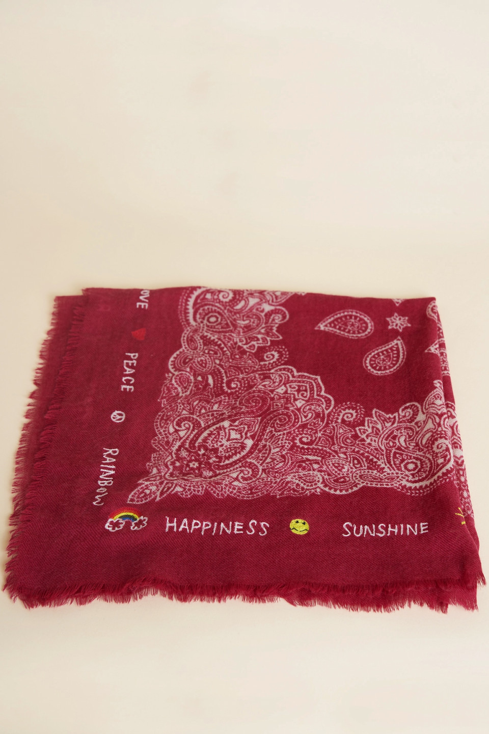 Colorful, soft and full of good vibes, the Star bandana in wool and silk brings a cheerful touch to all your outfits. His embroideries "HUGS", "LOVE", "PEACE"...