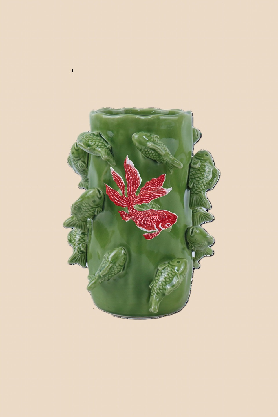 Green ceramic vase decorated with numerous small fish in relief, with a playful and charming style.