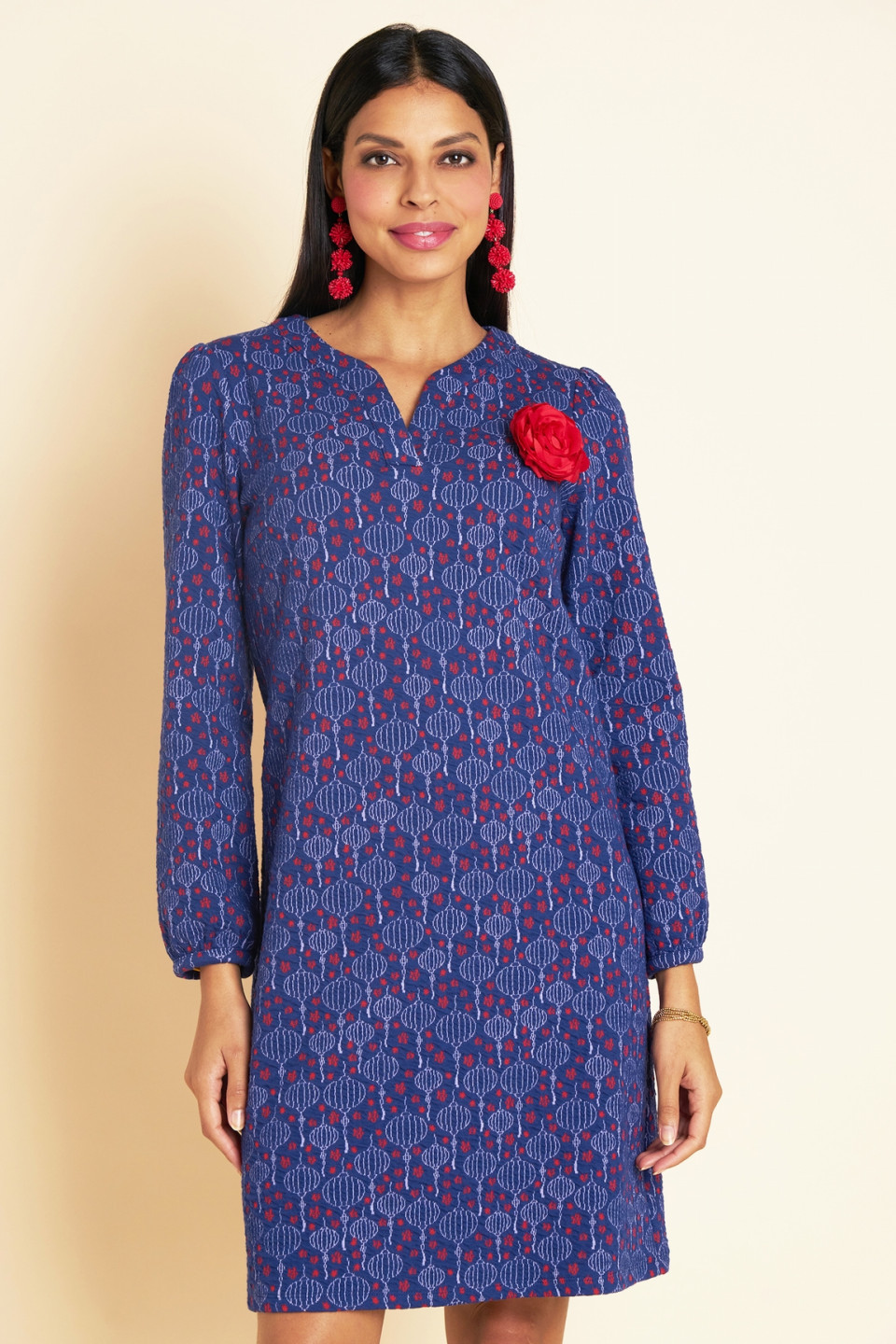 Assert your style with the Huan dress, a strong piece with singular charm. Exclusive jacquard sound adorned with lantern patterns captures light and catches the eye. Its split round neck, slightly puffed long sleeves and loose fit provide structure and comfort. Its knee length makes it an ideal ally for an assertive silhouette, between softness and elegance.