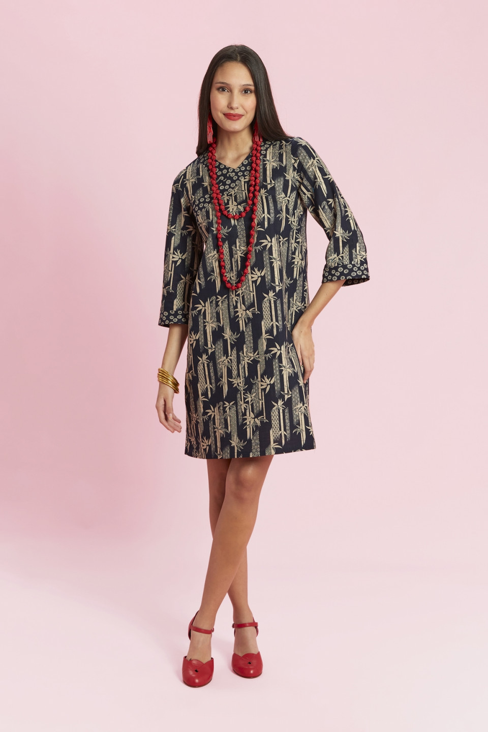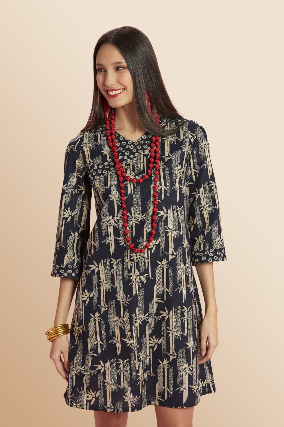 Let yourself be carried away by the uniqueness of the blue flared dress with its bamboo motif, inspired by Japanese style. The dress features two contrasting sleeves and a double-breasted collar in a floral fabric, further emphasising its originality.