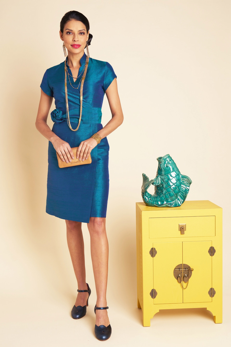 Choose this elegant Chinese dress wallet in wild silk, with its mao collar and wide belt tied at the waist.