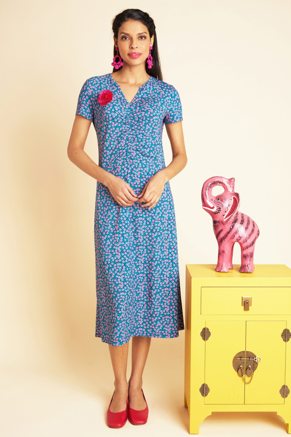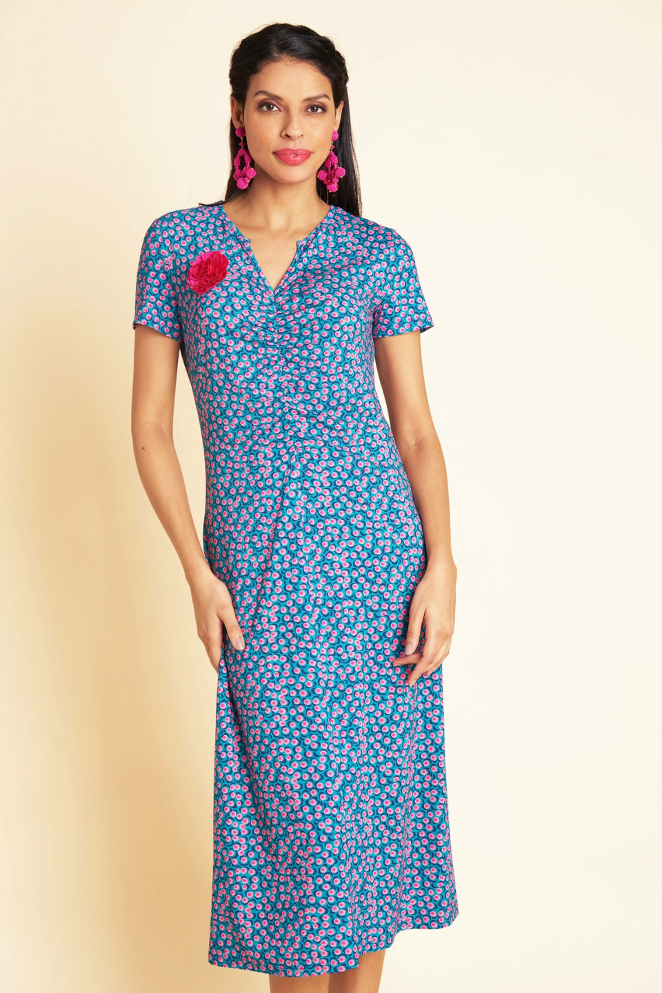 Let yourself be seduced by our long Georgette dress, a light and refined piece that brings elegance and fluidity to your silhouette. His exclusive printed Antoine and Lili, with delicate shades of blue and pink, illuminates the look with a fresh and feminine touch. The V-neck with finely gathered finishes subtly structures the bust and adds a romantic charm, while the short sleeves offer comfort and freedom of movement. Ideal for a sunny day, it goes well with both sandals and more formal shoes, for a chic and light style.