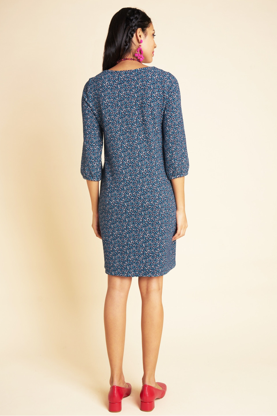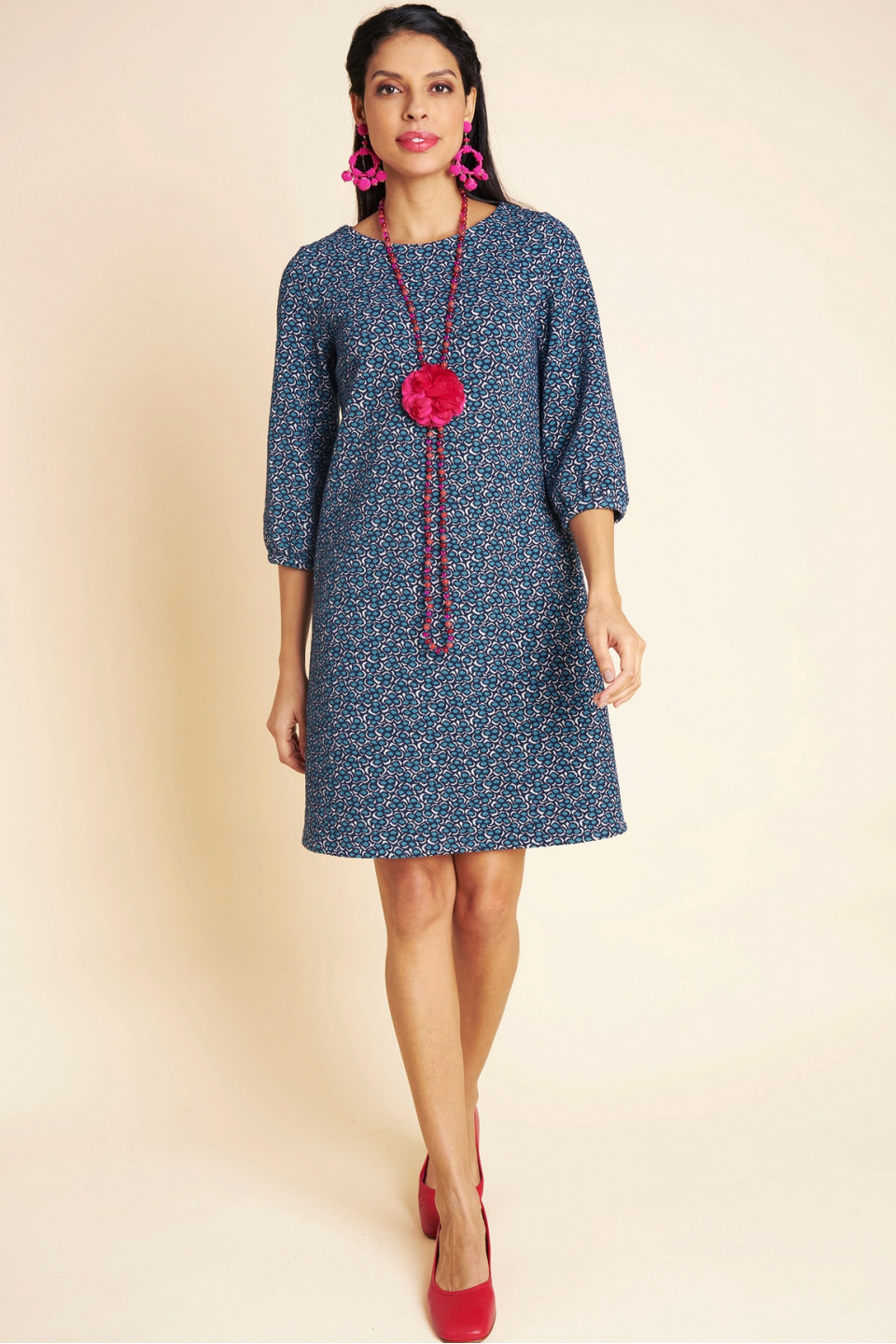 Discover our Bleuet dress, a piece with a chic and structured style that stands out for its 3/4 puffed sleeves and elegant round neck. Made in a structured and comfortable material, it highlights the silhouette while maintaining an impeccable fit. Its sleek style makes it a versatile model, easy to wear on a daily basis or for more formal occasions. Versatile, it goes equally well with ankle boots for a casual look as with pumps for a more sophisticated look.