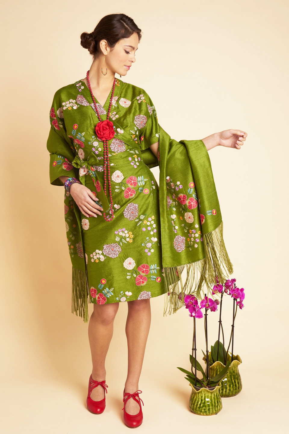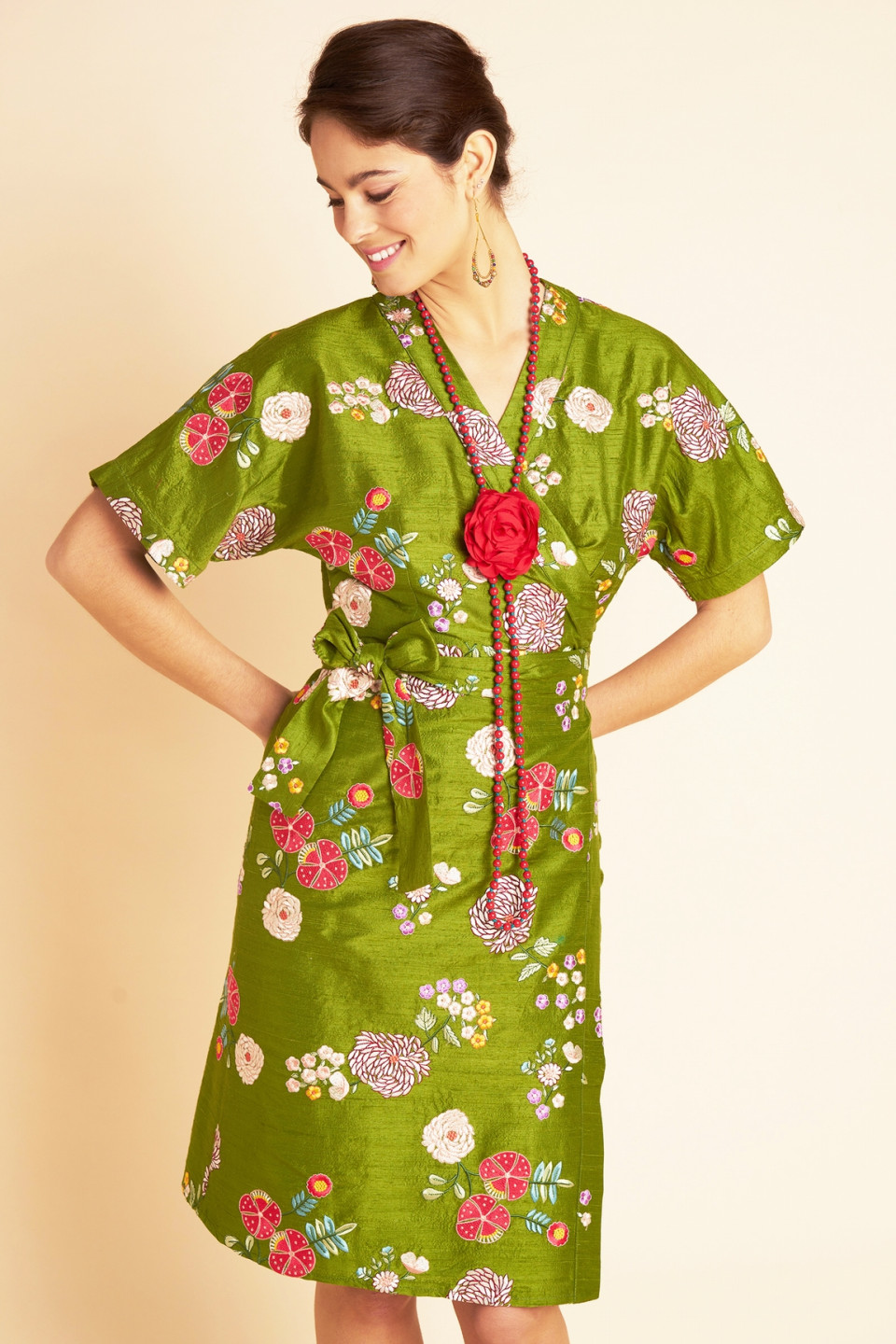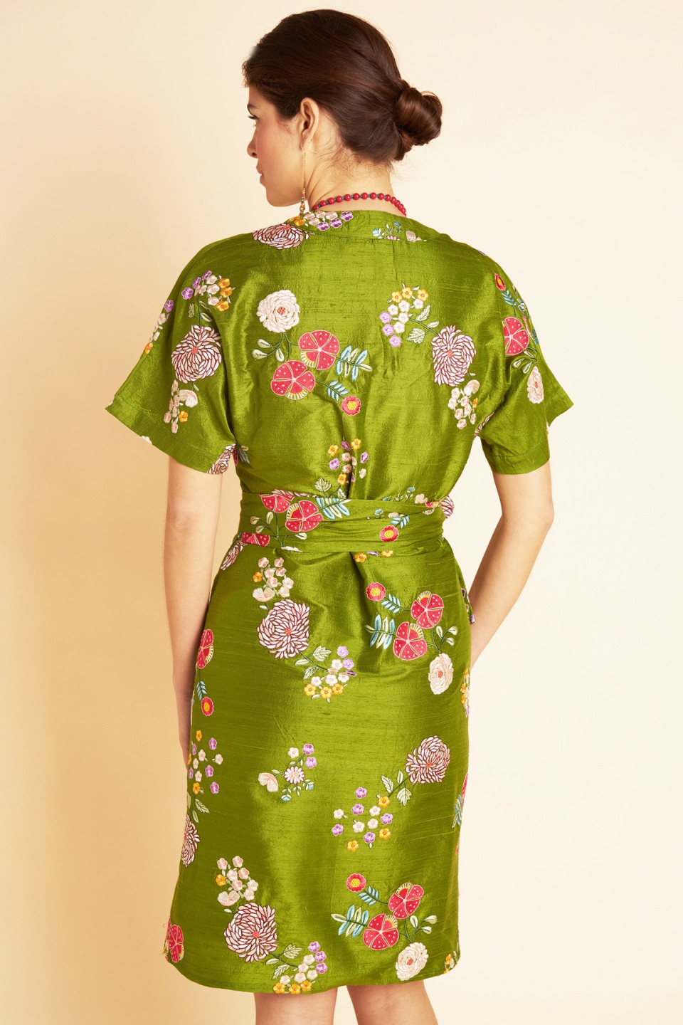 The dress Lydie in authentic wild silk is distinguished by its bright hue and its sumptuous floral embroideries, finely crafted, which come to sublimate the fabric with elegance and delicacy. 1 pieces of exception, these patterns bring relief, freshness and poetry to the whole. Inspired by the kimono spirit, its structured cut and short sleeves create a harmonious and feminine silhouette. Its wallet closure, accompanied by a wide tie belt, highlights the waist with precision and refinement. Both elegant and pleasant to wear, this dress is ideal for a sophisticated outfit, perfect for your dressed days as well as for your special occasions.