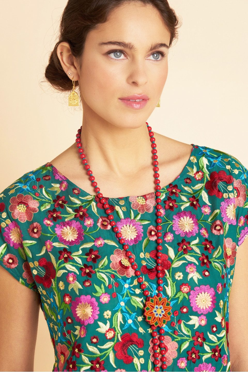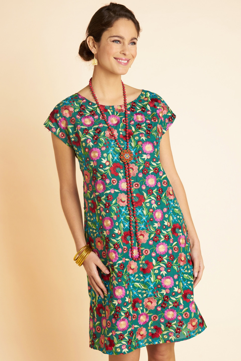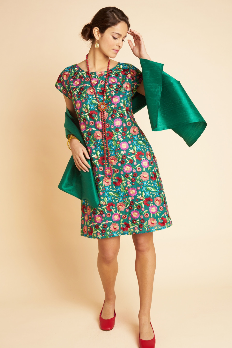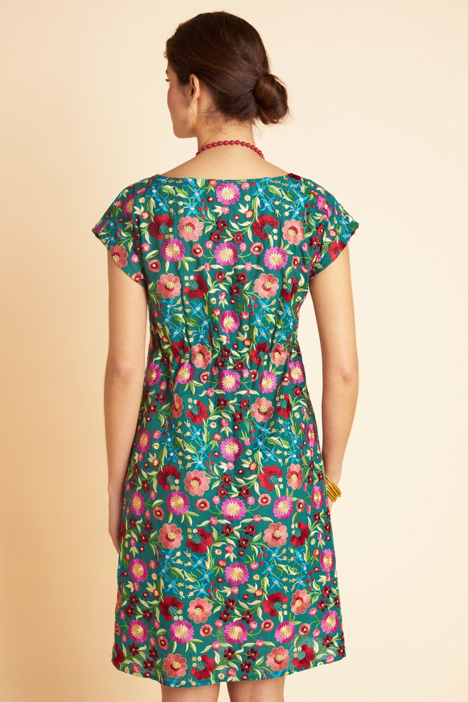 Discover the Camomile dress, a bright piece enhanced by a composition of delicately crafted flowers that bring relief and refinement to the whole. Floral embroideries with vibrant colors create a joyful and elegant look, full of character. Its straight cut, enhanced with short sleeves, highlights the silhouette with simplicity and femininity. At the back, an elastic with a subtle draped effect allows the dress to be adjusted delicately for a harmonious fall.