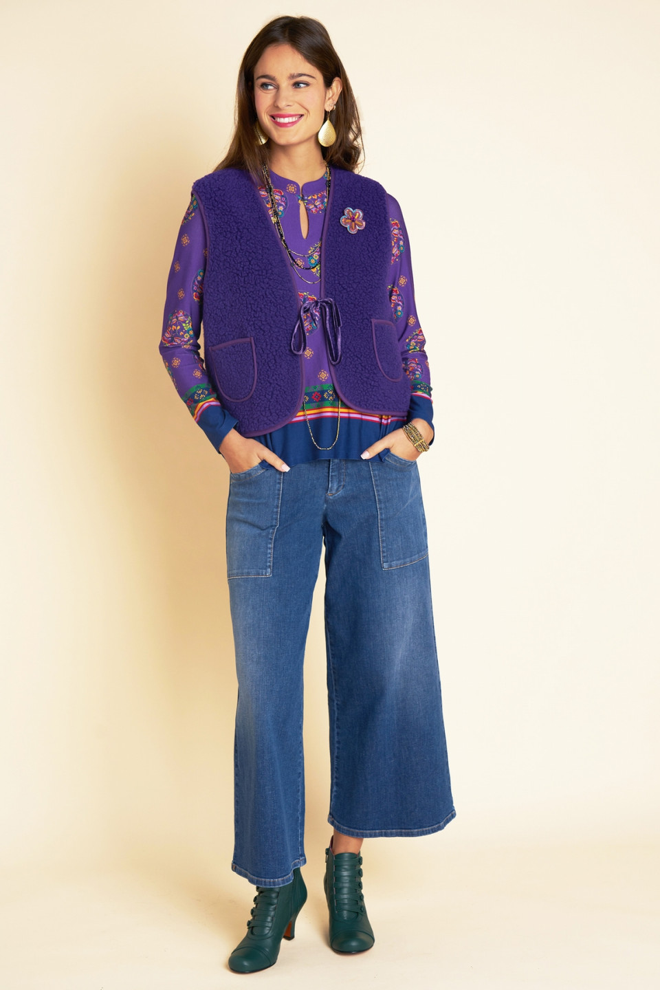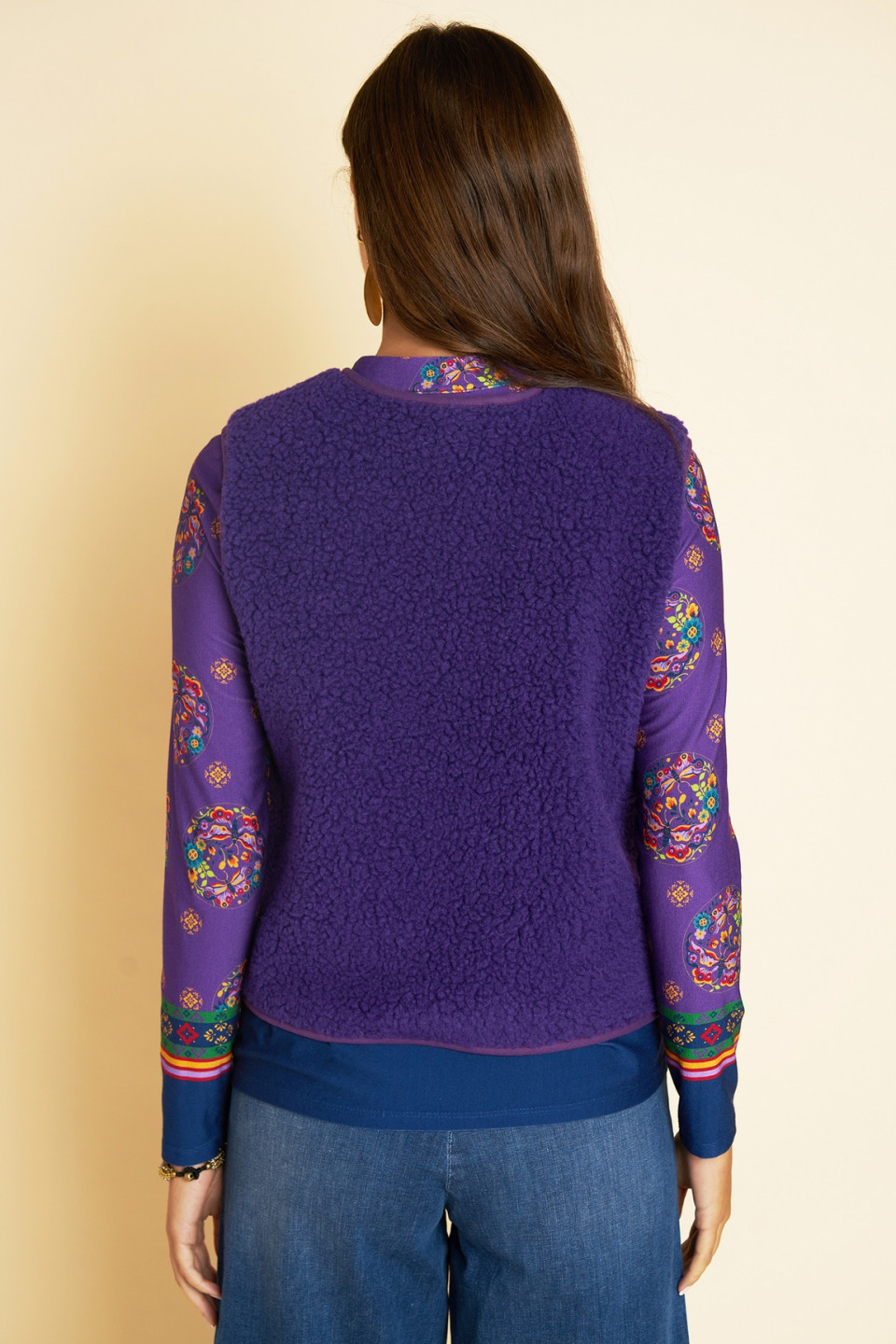 Fall for the short-sleeved Agathe vest , in a beautiful deep purple, which combines softness and originality. Its molded effect material envelops your outfits with an irresistible comfort, while its finishes on the ends and pockets give it a graphic and refined look. Adorned with two pockets at the front and closed by a delicate velvet-effect knot, this vest full of character warms your look with style, while bringing a touch of subtle fantasy.