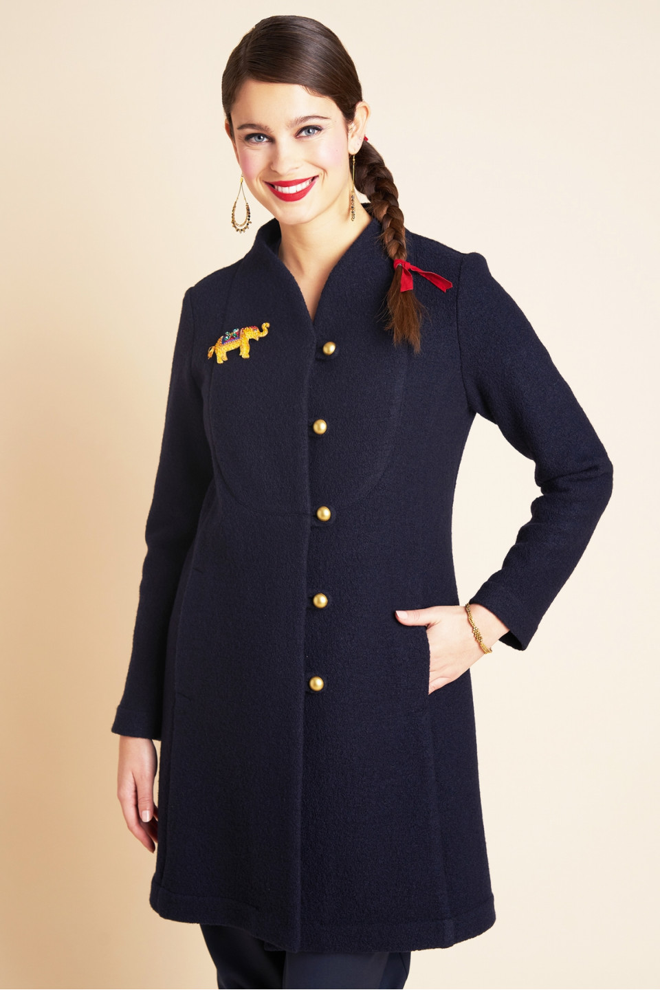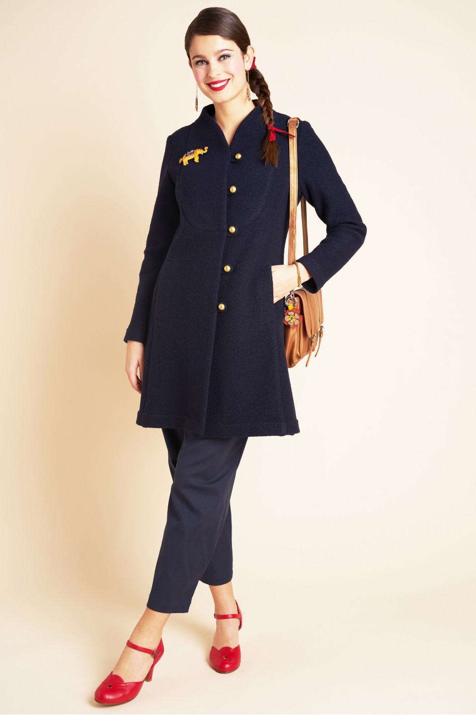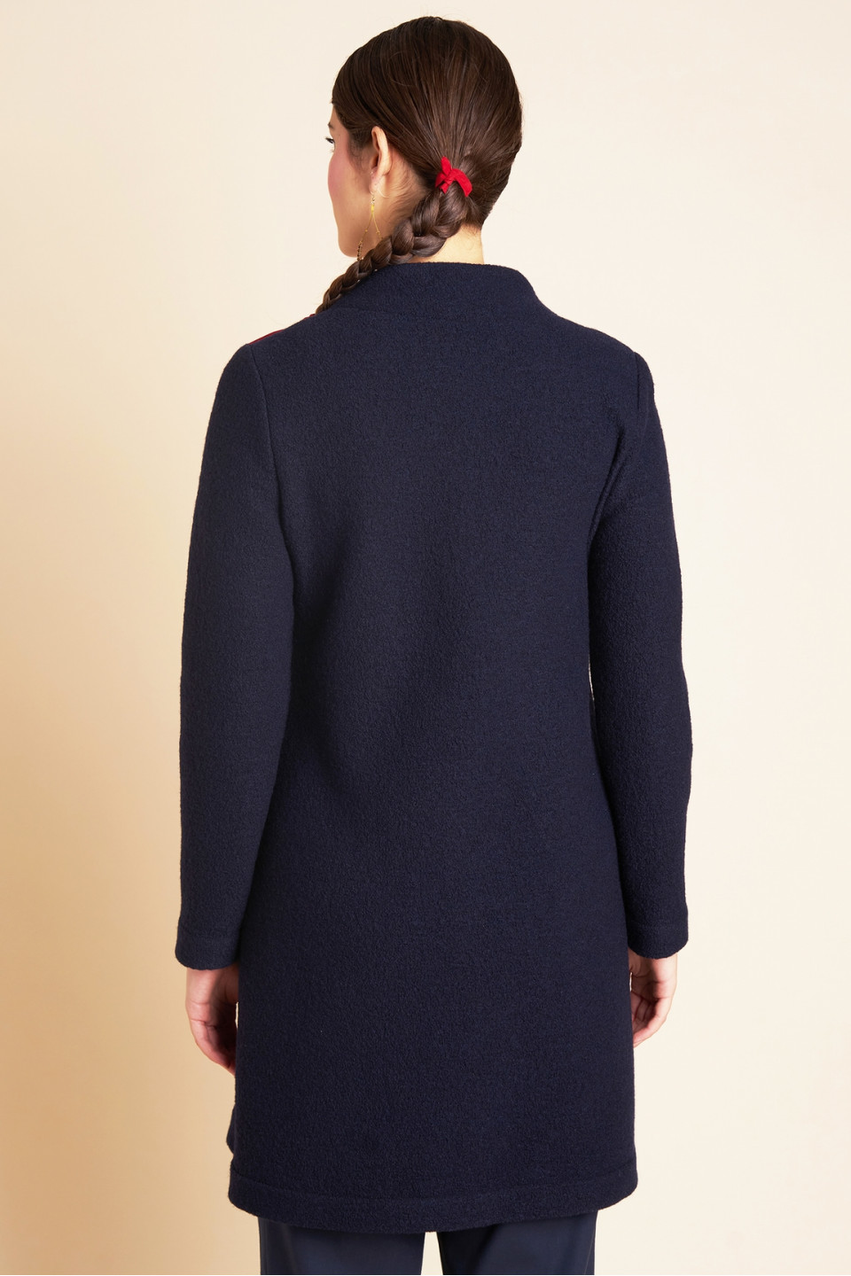 Let yourself be seduced by our Alma coat in virgin wool, with a delicate and tapered look. Its gold button closure adds a sophisticated and elegant touch. The round neck, slightly plunging, gives a figure both charming and refined. This coat also has two front pockets, subtle lapels on the sleeves and a rounded effect at the chest, which complete its elegant design.