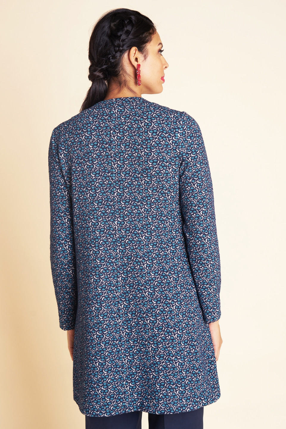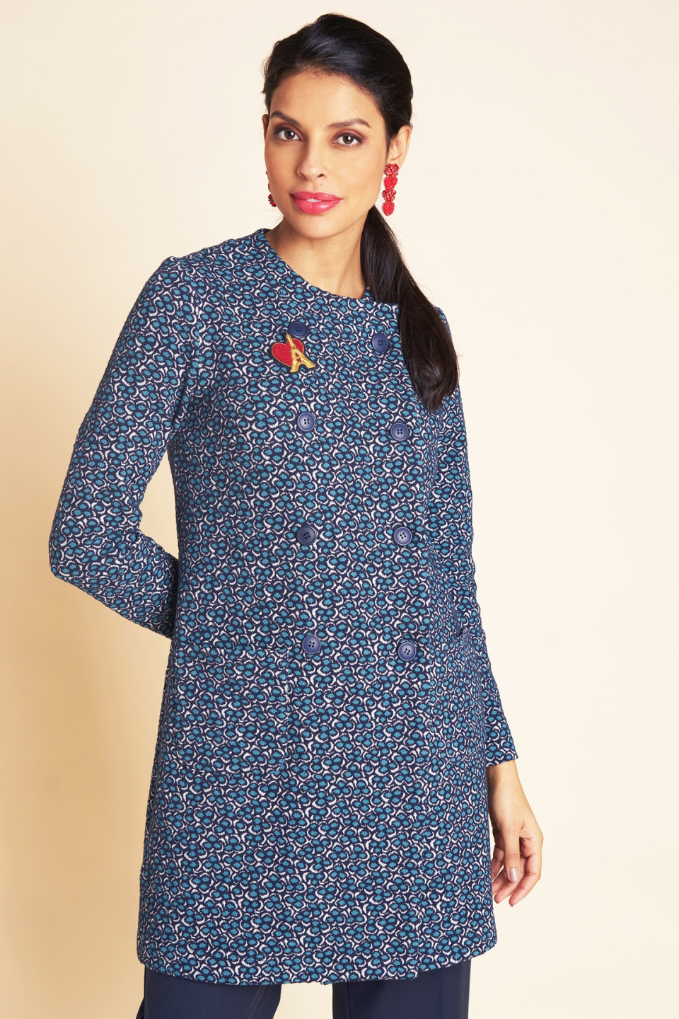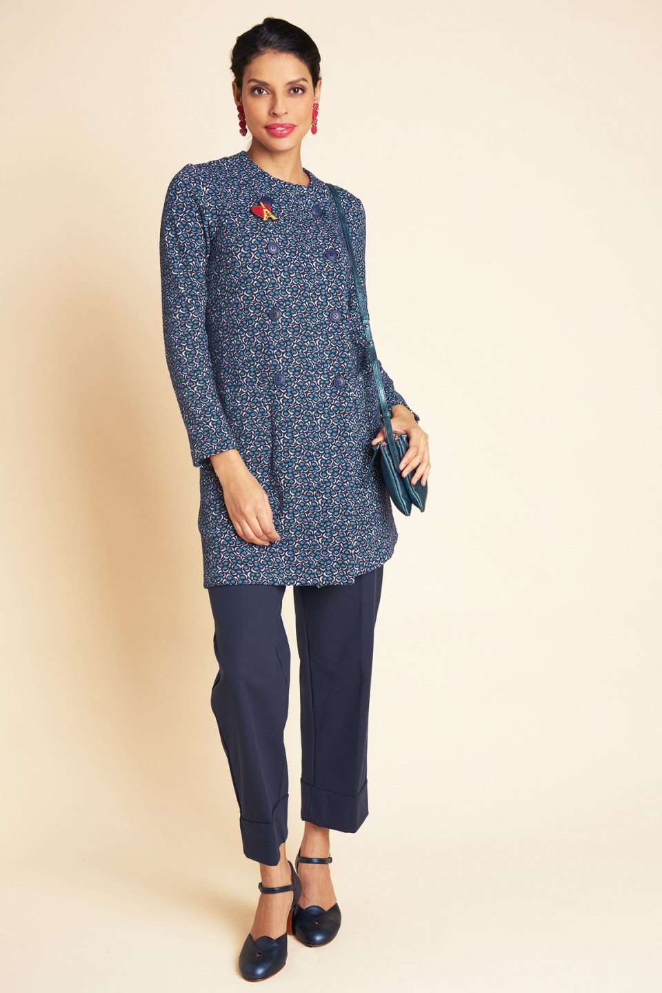 Discover our Bleuet coat, an elegant piece with a structured style. Its half-long and straight cut enhances the silhouette with sobriety and modernity. Crafted in an exclusive jacquard, it ensures comfort throughout the day. Its button closure, enhanced with decorative buttons, brings a classic and refined touch.