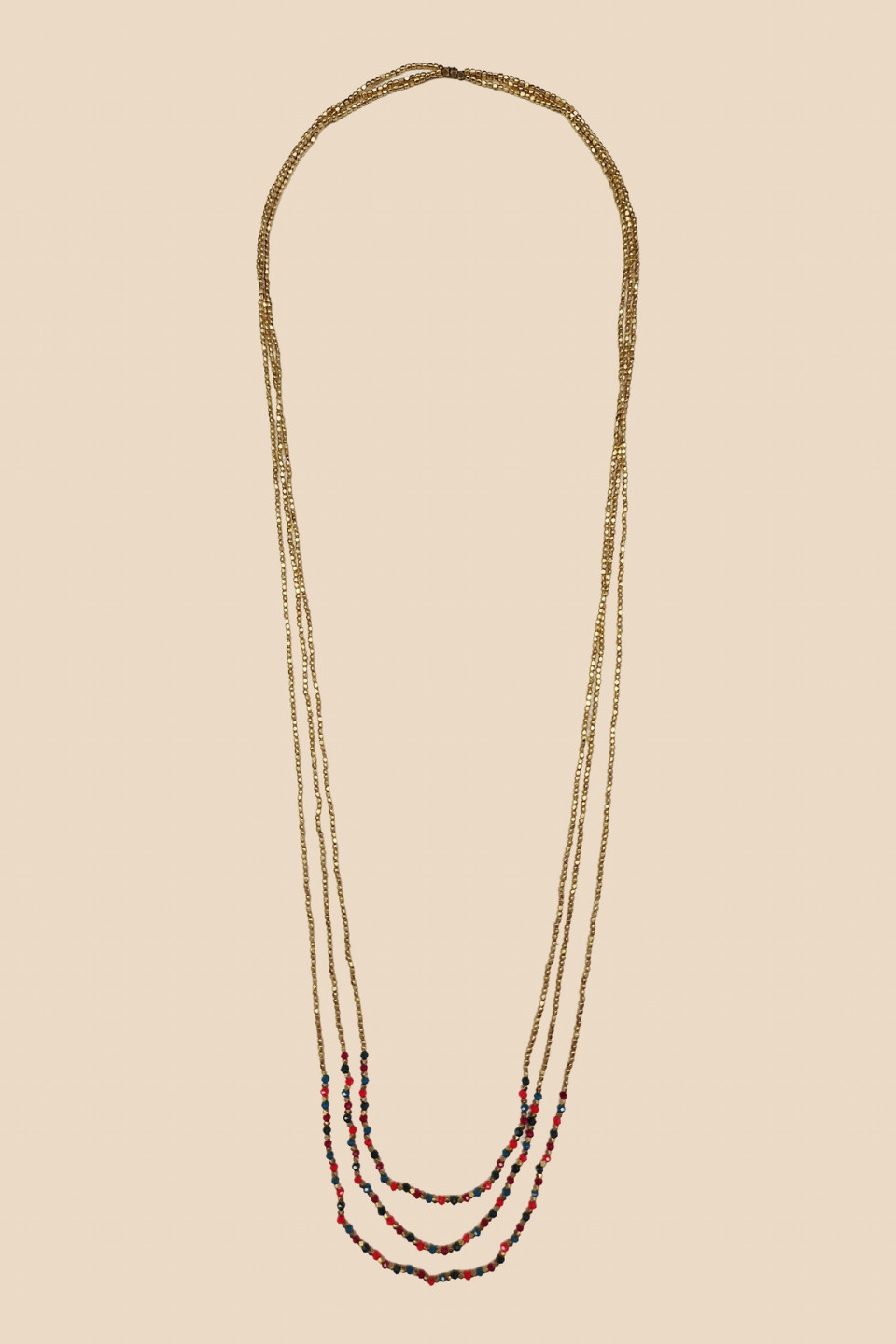 This 3-row necklace is composed of golden and colored beads. Wear it with a top or a dress, it will sublimate all your outfits. Composition: brass and glass beads