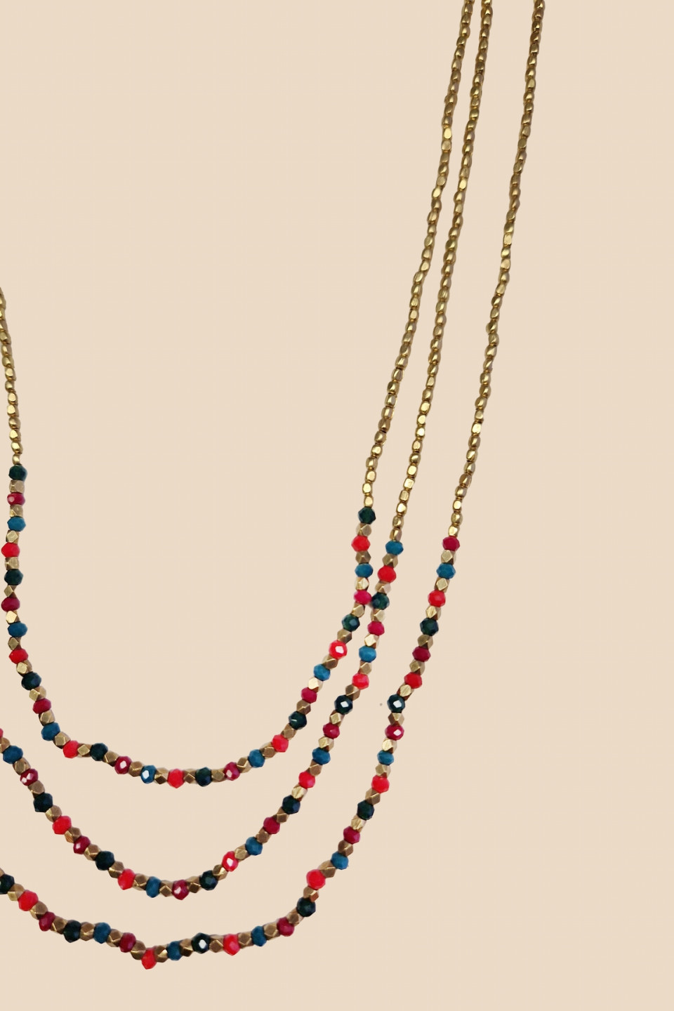 This 3-row necklace is composed of golden and colored beads. Wear it with a top or a dress, it will sublimate all your outfits.