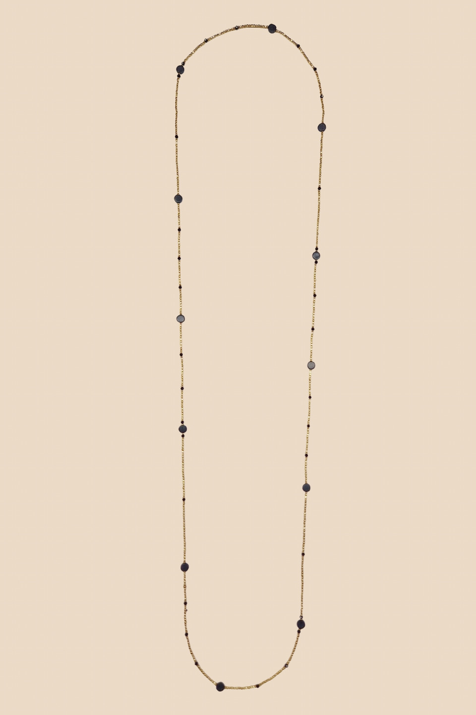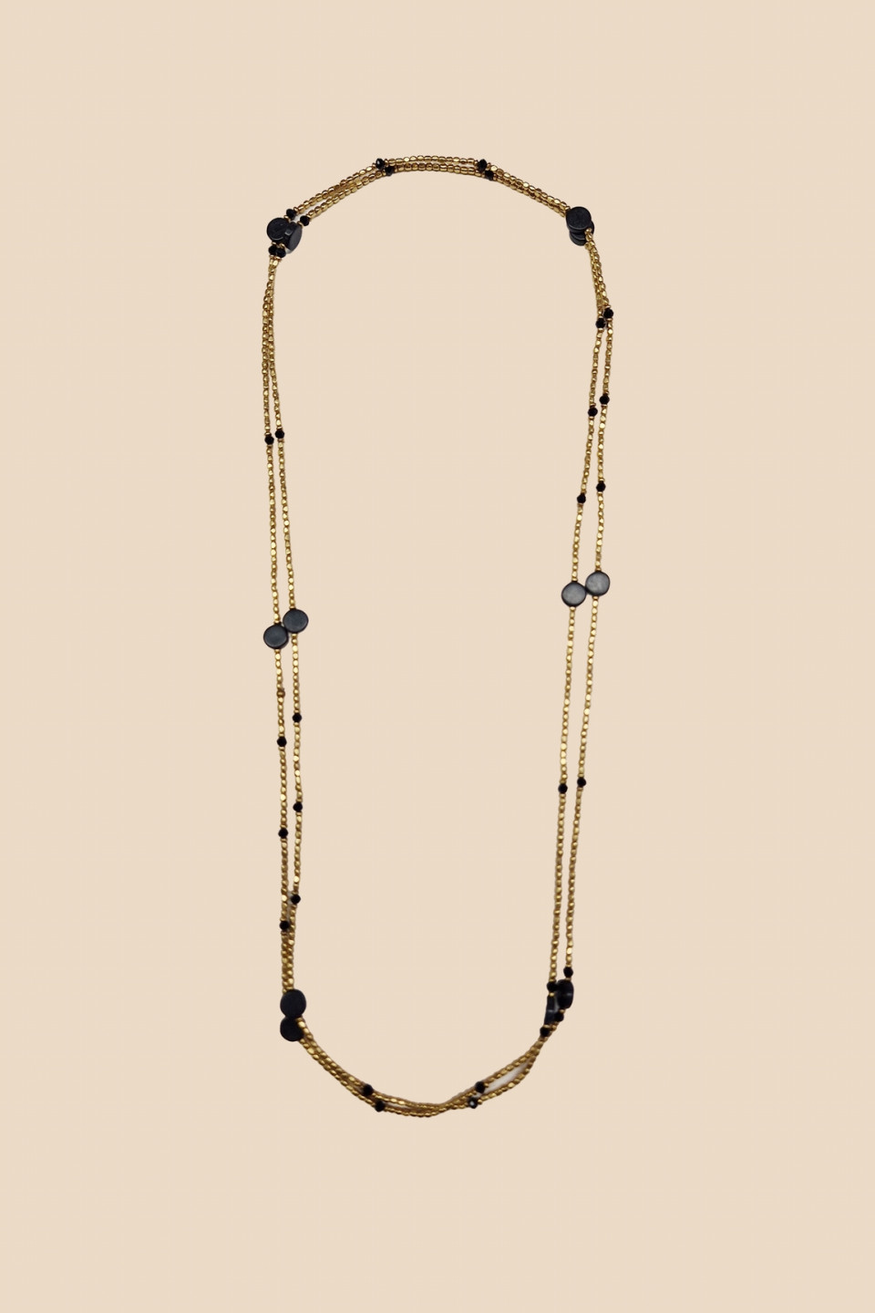 Let yourself be seduced by our Dara Gini necklace, combining refinement and ethnic inspiration. Its fine golden and black pearls, round and sparkling, delicately enhance your décolleté. Thanks to its adjustable length, it adapts to all your desires and perfectly complements each of your outfits.
