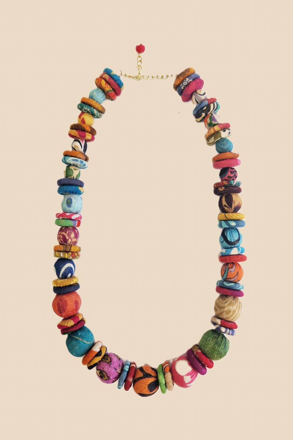 Add character to your silhouette with this necklace combining round and flat beads in multicolored fabric. An original and expressive composition that catches the eye and signs a decidedly unique look.