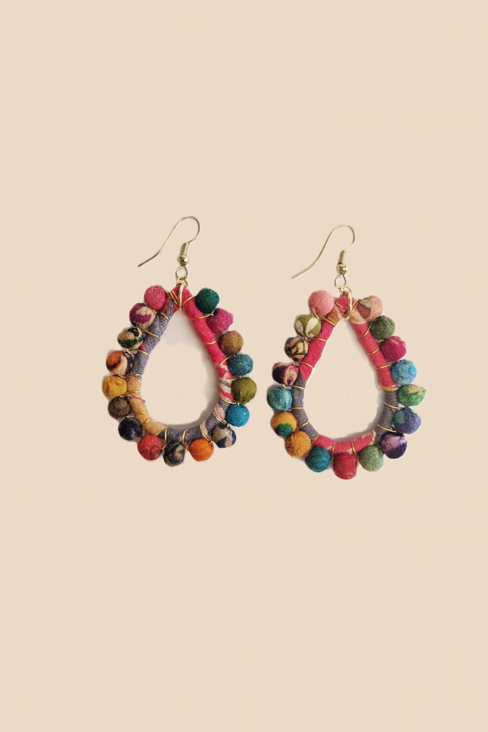 Add a touch of bohemian chic to your jewelry collection with this elegant pair of hoop earrings, enhanced by small balls of colored drop-shaped fabric.