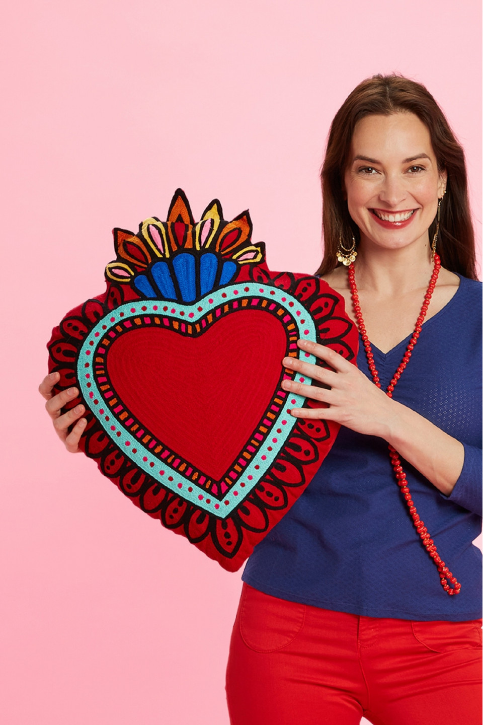 Mexican inspired pillow in the shape of a heart. The Milagro Heart is inspired by the ex-voto milagros hearts of Mexico.