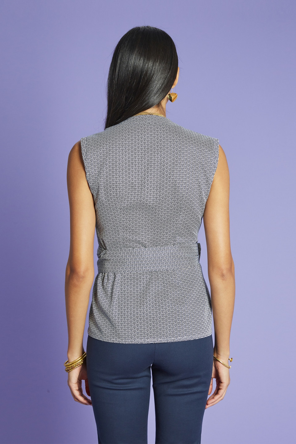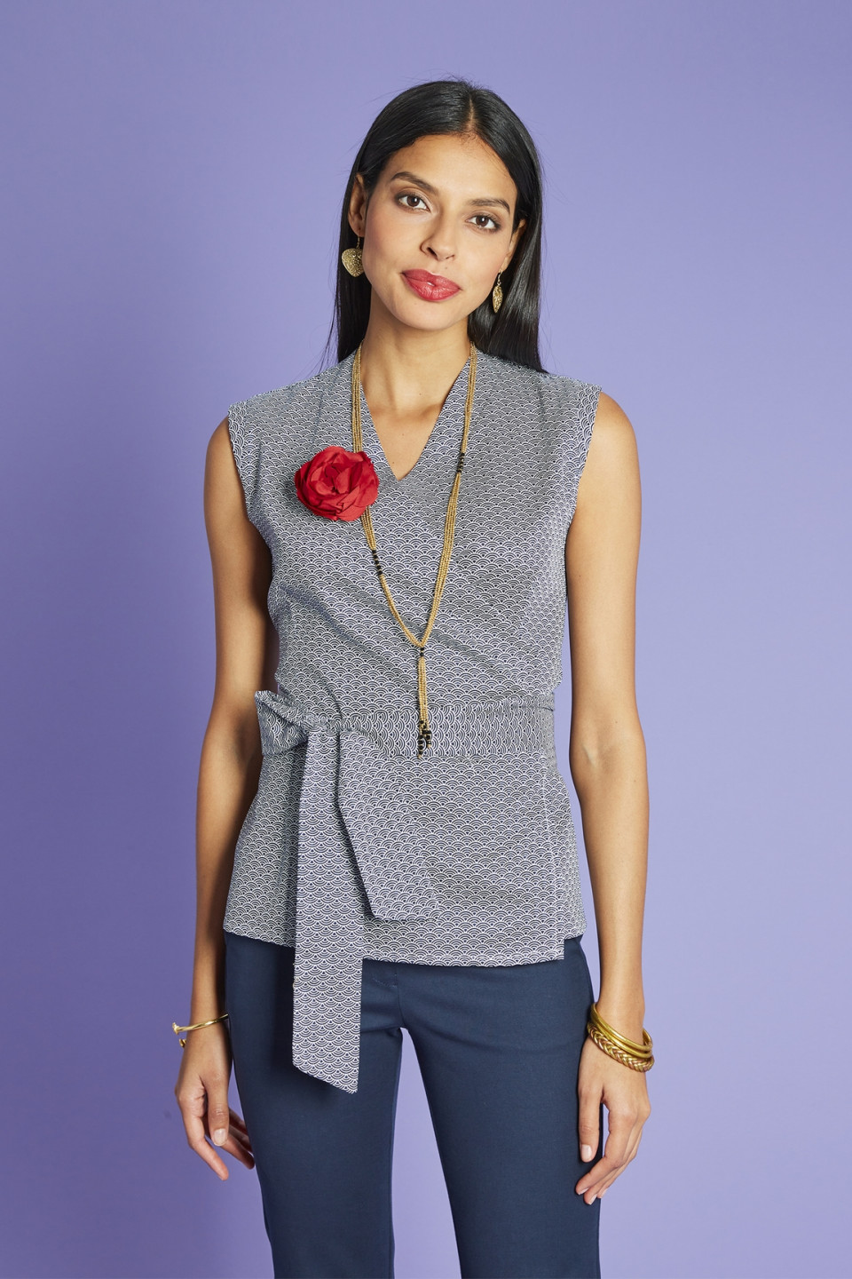 Our Yoko wrap-around top with its geometric print will give all your outfits a dressy edge, even when worn with raw denim jeans!