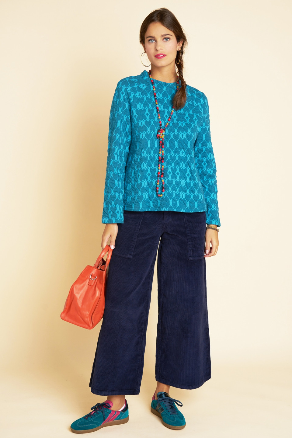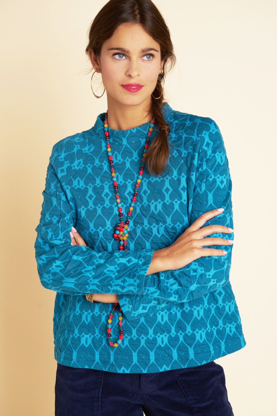 The top Jeannette combines elegance and comfort with subtlety. Its exclusive pattern and relief texture enhance its cotton garment. Its slightly raised round neck delicately emphasizes the head port, while its long sleeves and loose fit ensure ease and freedom of movement. It offers a natural and pleasant outfit to wear.