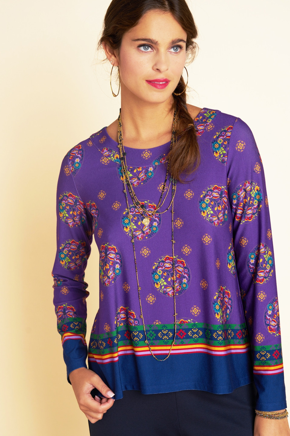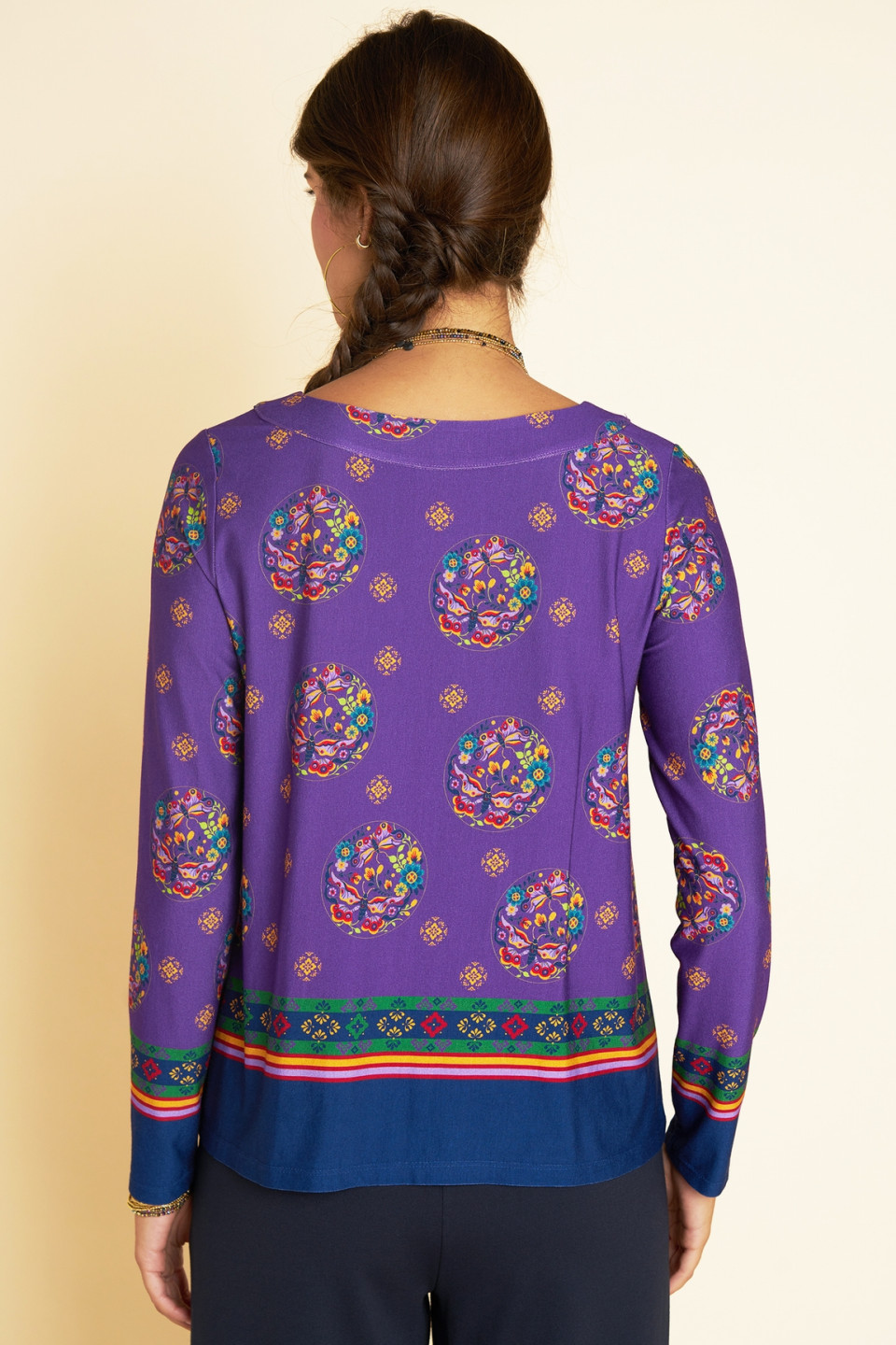 Let yourself be seduced by the Halong wide top and its bohemian spirit, illuminated by an exclusive printed mixing floral patterns and butterflies on an intense purple background. Its loose and fluid fit offers a relaxed look while ensuring absolute comfort. Light and feminine, this top can be worn with jeans for a casual look as well as with a skirt or a pair of trousers for a more formal silhouette. A must-have full of charm and softness to brighten up your wardrobe.