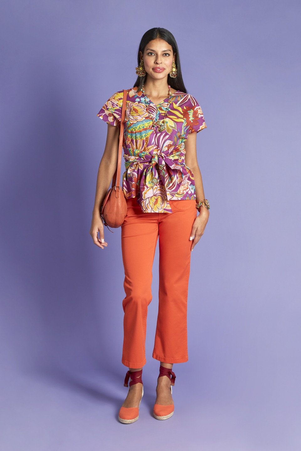 The shape of this new Floria top in cotton voile is very original! The fabric, with its exclusive floral print, is very light and pleasant to wear in summer. The top can be adjusted with a side zipper and a large bow at the waist adds a feminine touch to the silhouette. The Floria top can be worn with colored chinos or jeans for a more casual look.