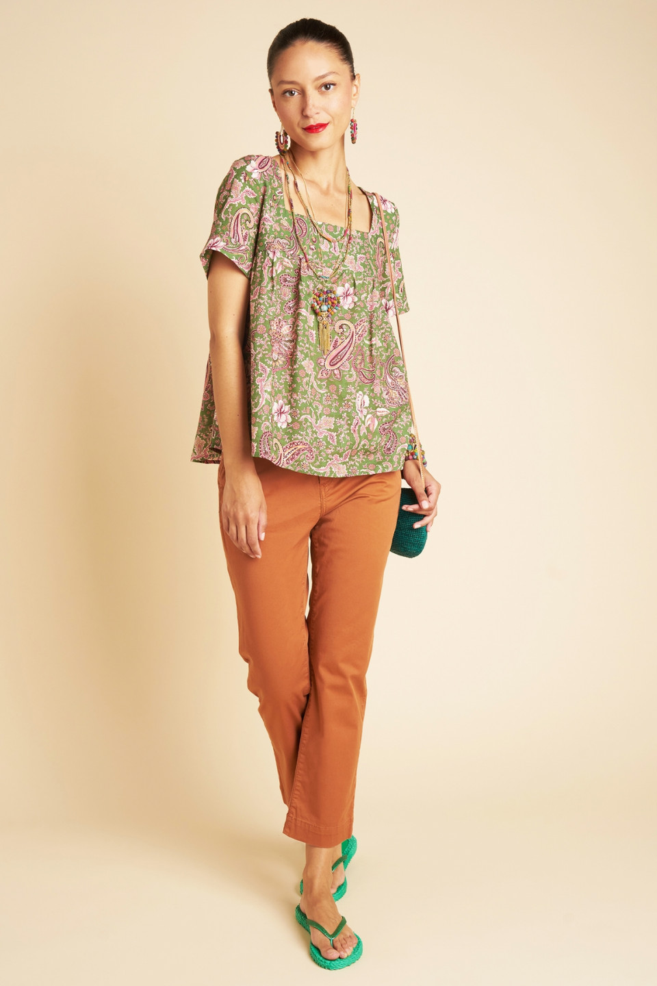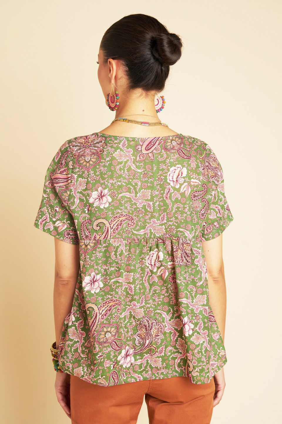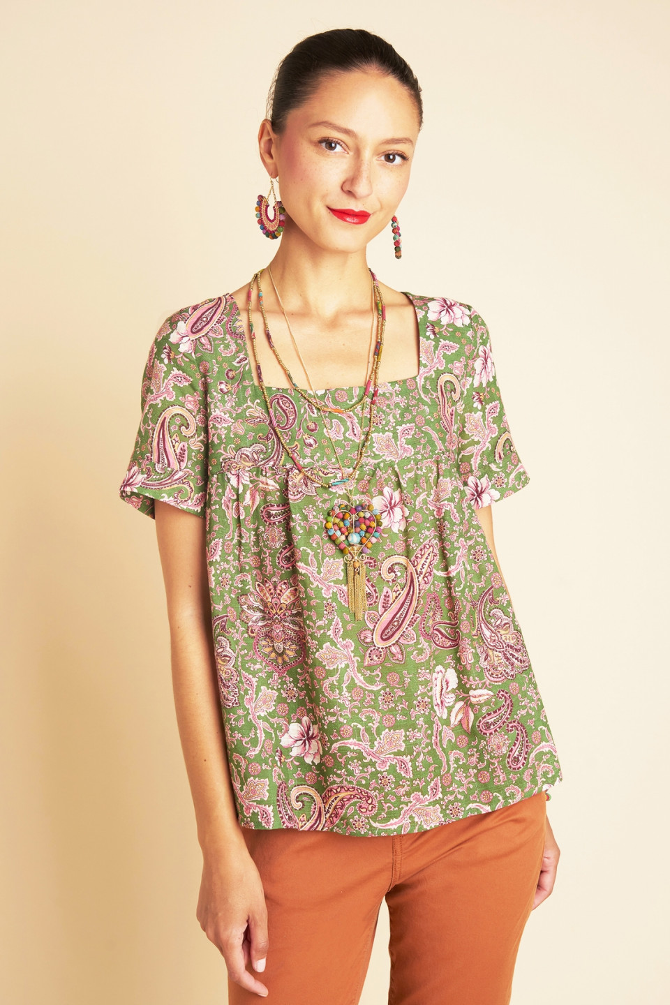 Let yourself be seduced by the softness and lightness of our cashmere blouse, sublimated by a beautiful combination of green and pink, and a delicate floral pattern with subtle and shiny threads. Featuring an elegant square collar and loose-fitting short sleeves, this light, flared blouse offers a fluid fit that provides both comfort and freedom of movement. It stands out for its pleasant texture and its ability to add a bohemian touch to your look. Ideal to wear with jeans, a skirt or even shorts, this versatile piece becomes an essential in your wardrobe.