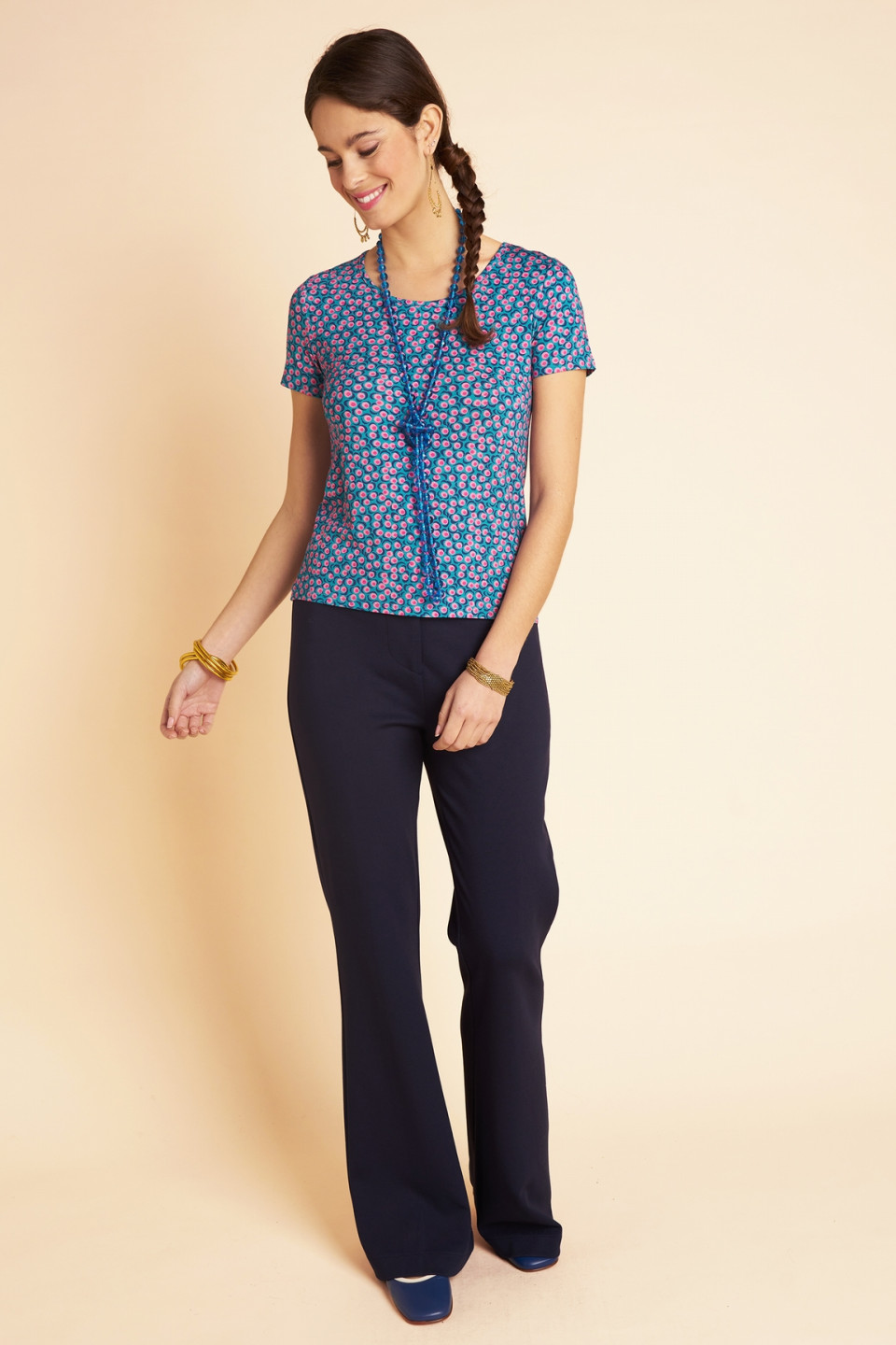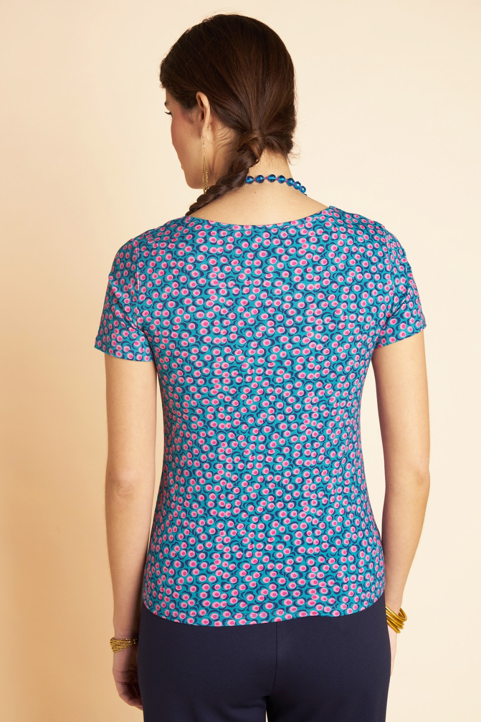 Succumb to the charm of our Georgette T-shirt, a bright piece that brings sparkle and personality to your outfits. Exclusive printed sound by Antoine and Lili, with bright and intense colors, immediately adds pep’s to your look. The simple and elegant round neck subtly highlights the neckline while letting the fabric express itself in a fluid and airy fall. Versatile, it can be worn with plain pants as well as with a flowing skirt. Light and comfortable, it accompanies your movements with ease.