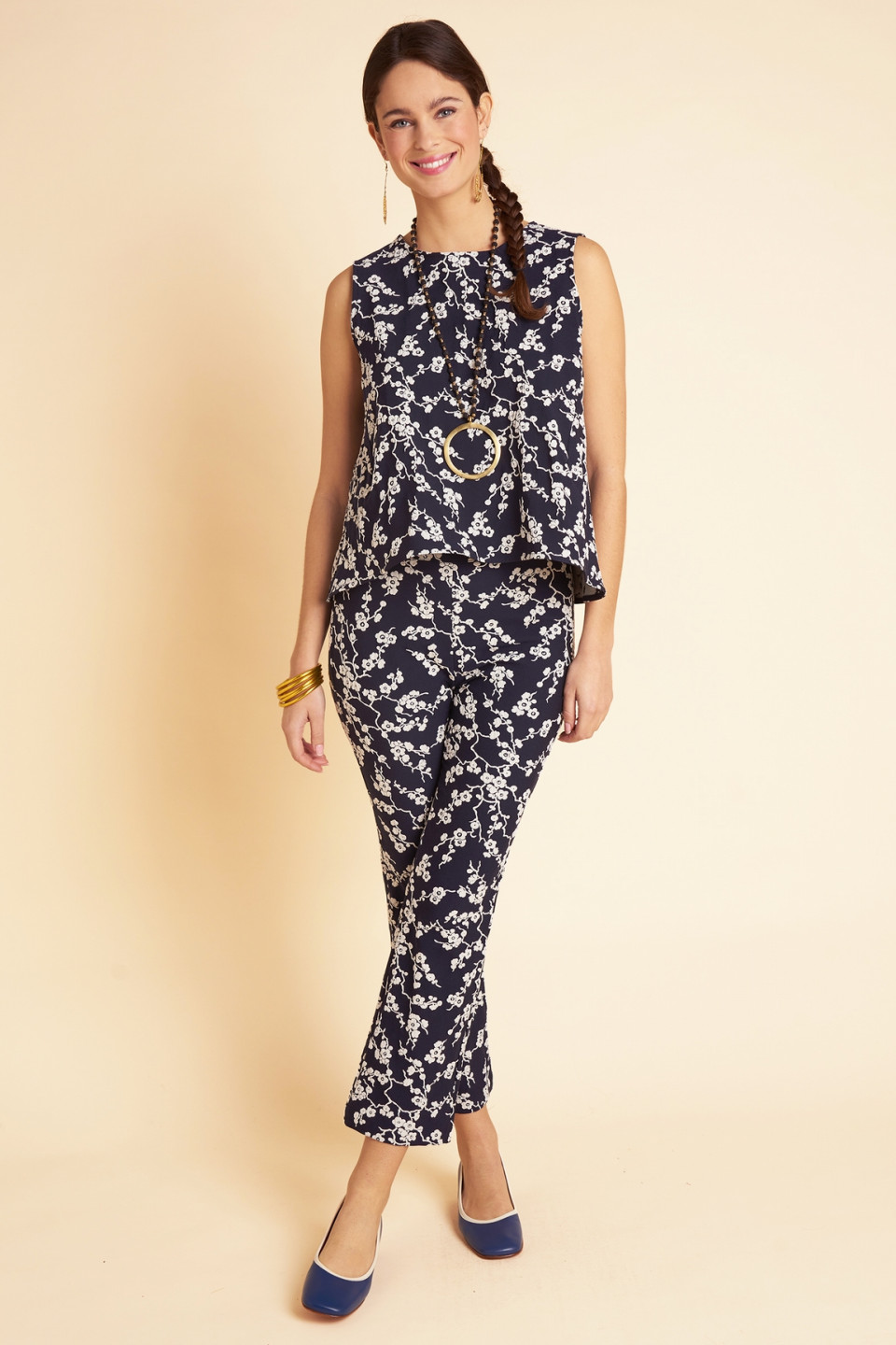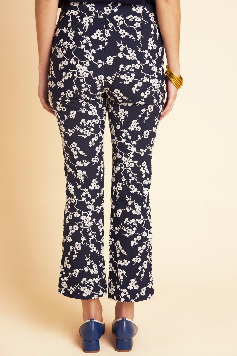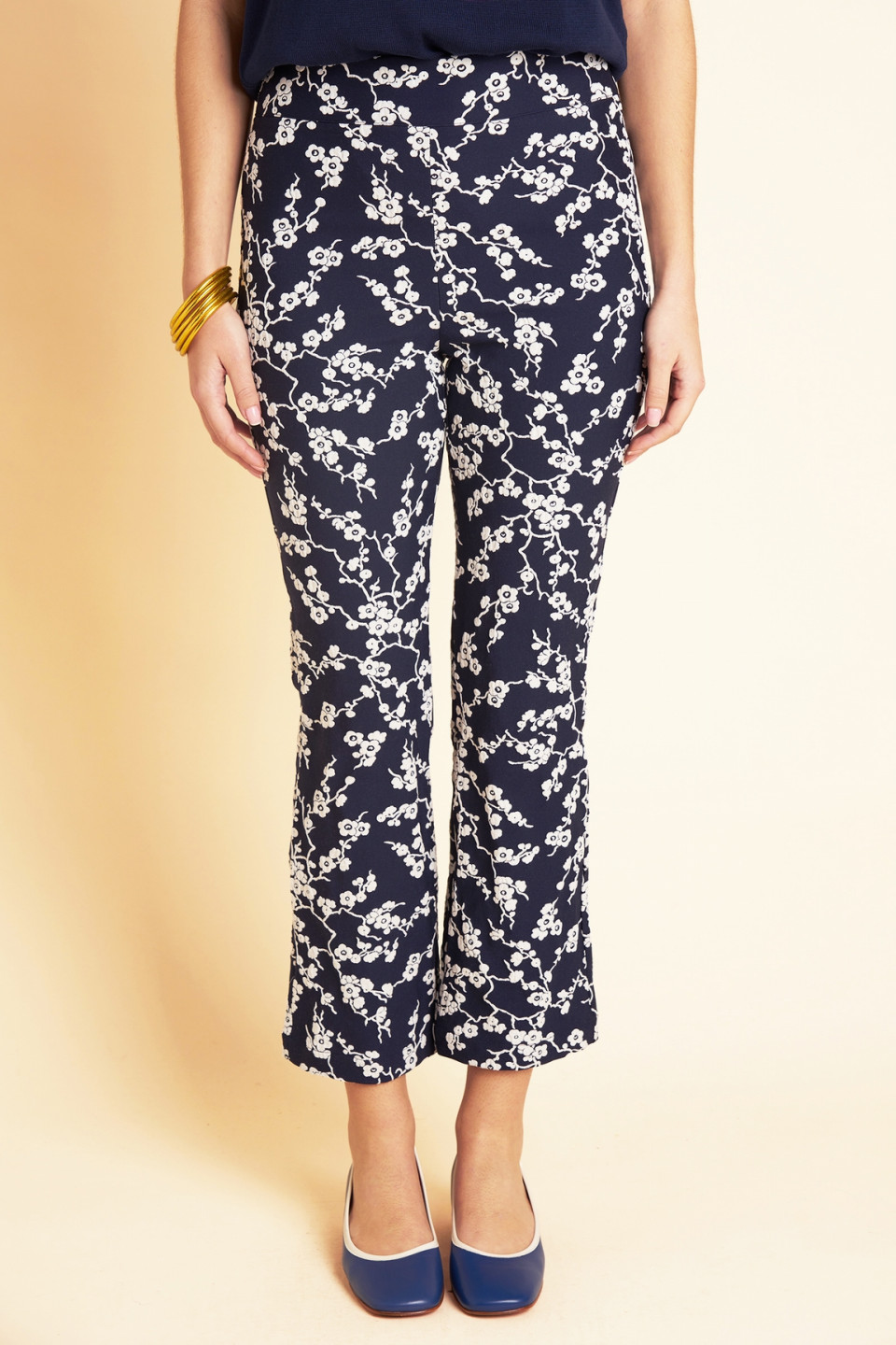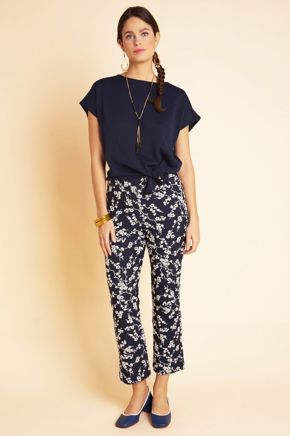 The Sakura pants is a refined piece that combines modernity and elegance. Its slightly trumpet cut, close to the body, subtly marries the natural lines of the silhouette, offering a structured and assertive look. Made in a deep blue fabric, it is enhanced by white floral patterns in slight relief, recalling the delicacy of cherry blossoms. The discreet side zipper ensures practicality while maintaining the room’s sleek aesthetics.