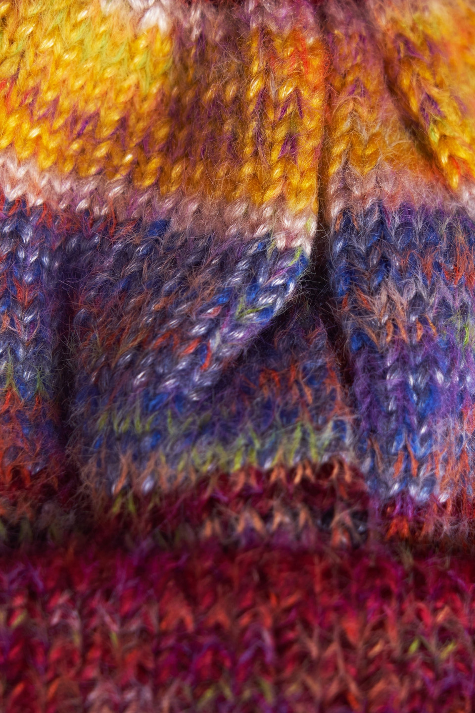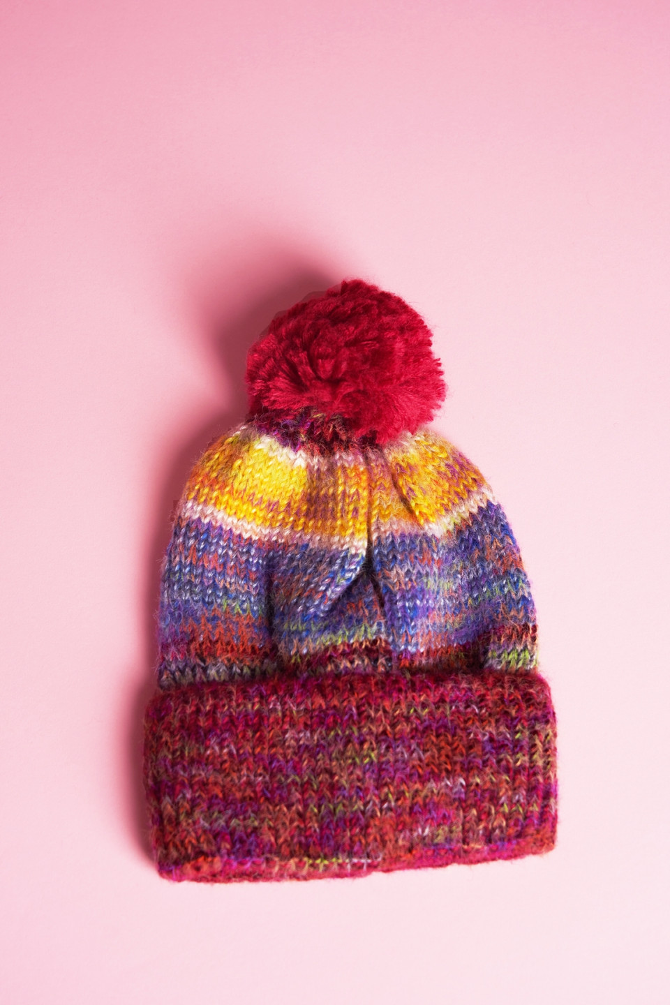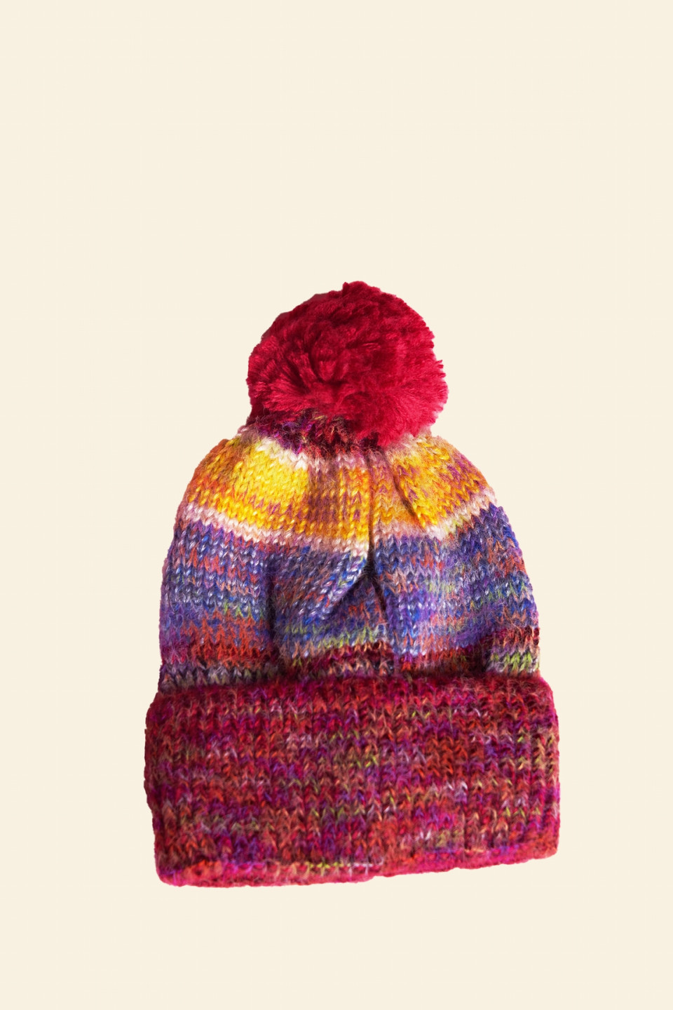Ajoutez une touche de fun à votre tenue d'hiver avec notre bonnet multicolore orné d'un pompon. Ce bonnet est Parfait pour un look hivernal tendance et confortable.