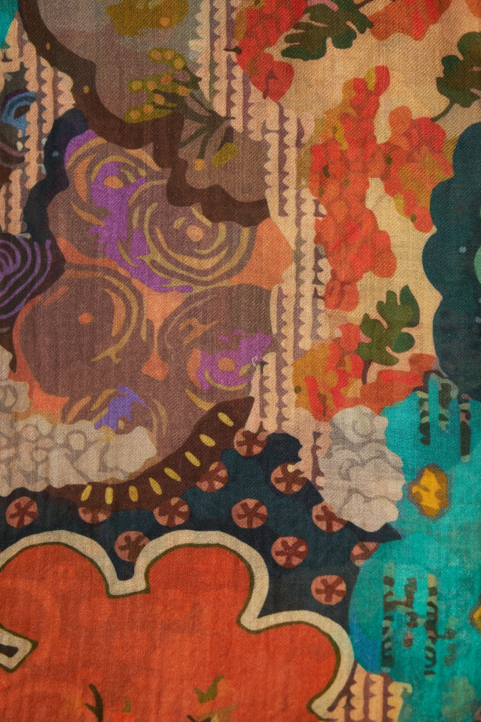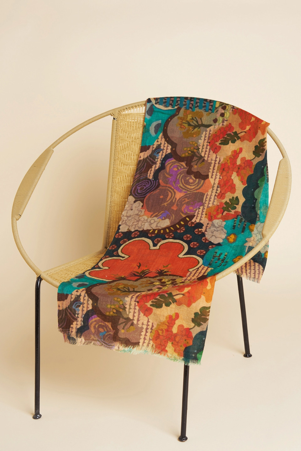 Avec ses motifs floraux et abstraits, ce foulard en laine et soie est une véritable œuvre d’art à porter. Son design expressif et ses détails subtils en font un accessoire fort, capable de transformer une tenue simple en un look affirmé.