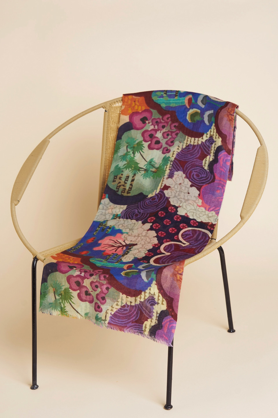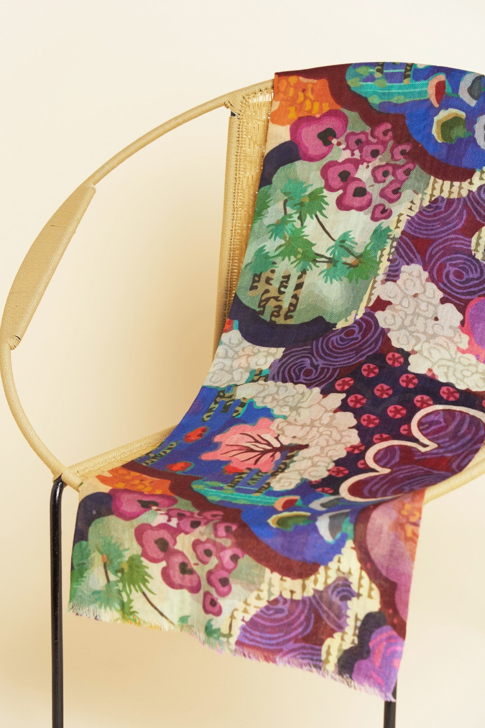 Avec ses motifs floraux et abstraits, ce foulard en laine et soie est une véritable œuvre d’art à porter. Son design expressif et ses détails subtils en font un accessoire fort, capable de transformer une tenue simple en un look affirmé.