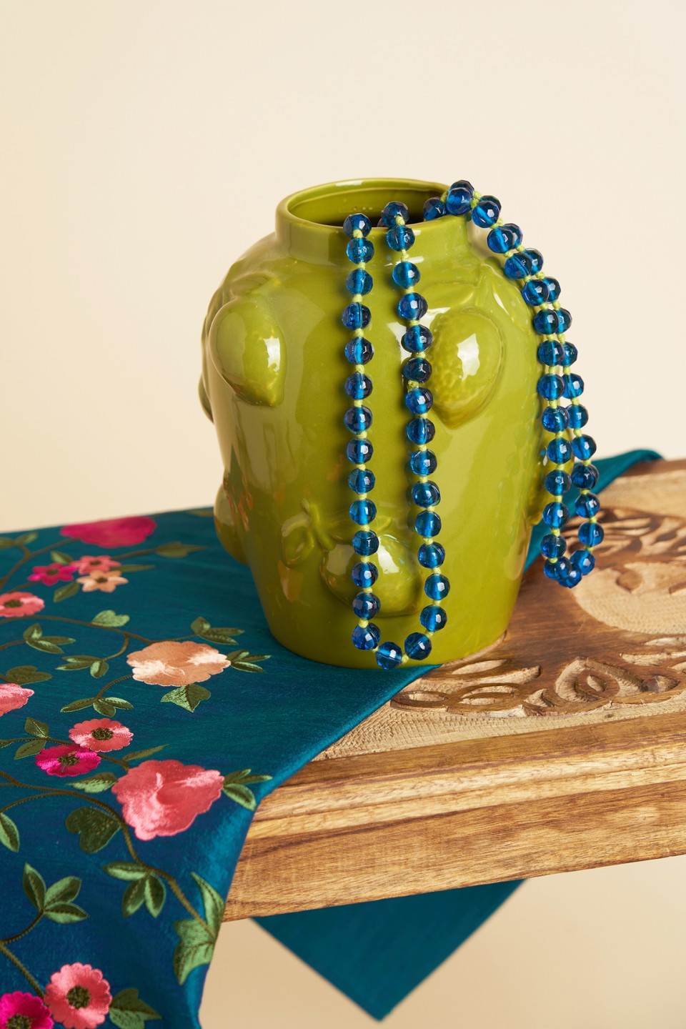 Voici un long collier en véritables perles de verre ciselées, aux couleurs brillantes et translucides. Un travail raffiné de montage sur un fil viscose de couleur contrastée sépare chaque perle par un petit nœud.