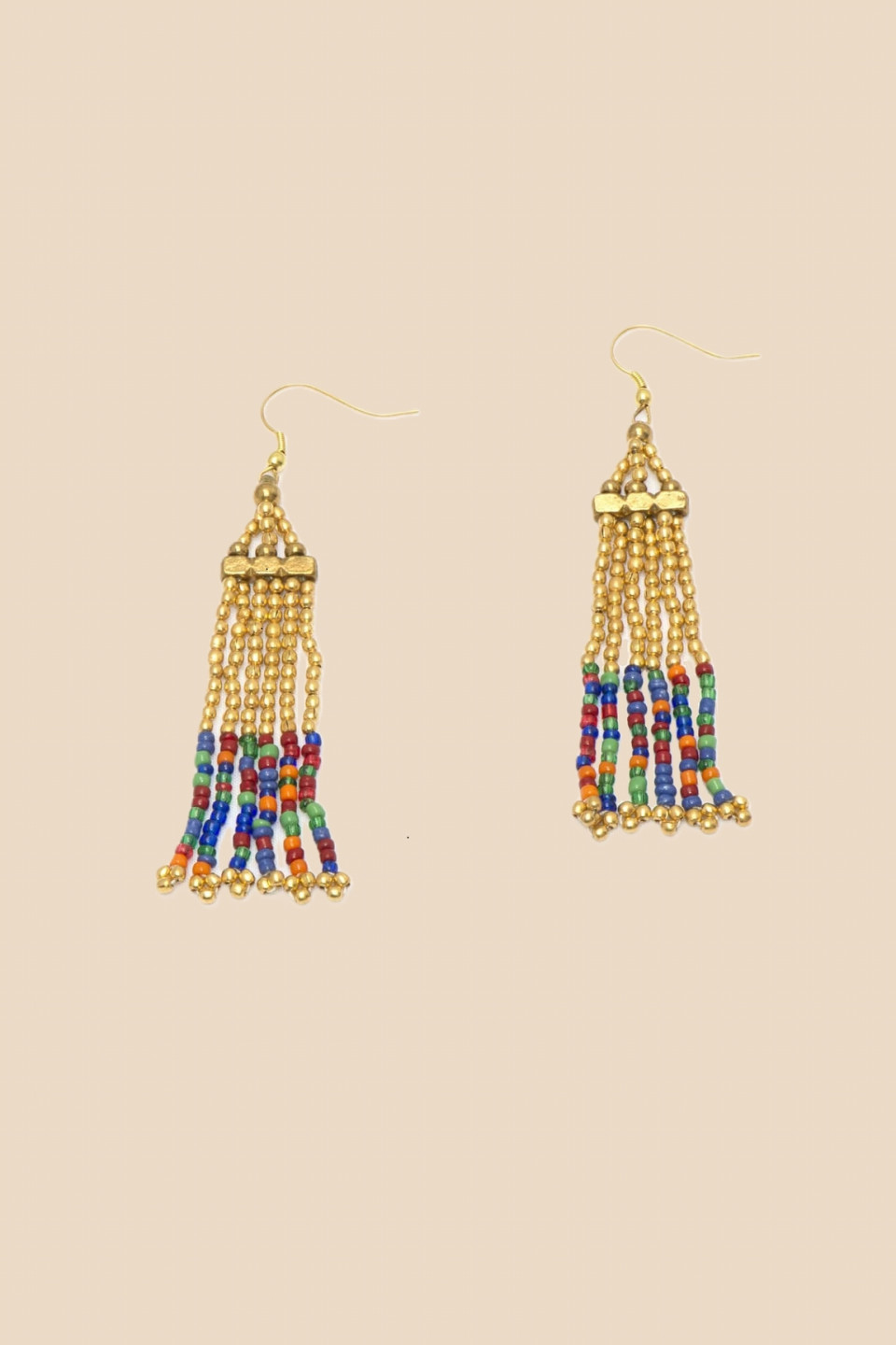 Coup de cœur pour ces magnifiques boucles d’oreilles pendantes ! Elles vous séduiront par le mouvement délicat de leurs lignes de perles dorées, sublimées par de jolies touches de perles colorées.