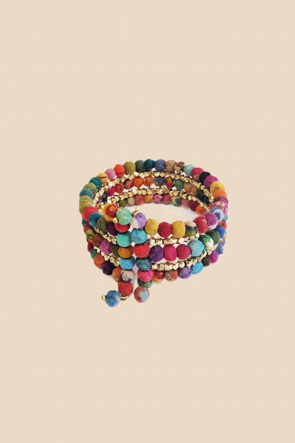 Ajoutez une touche de fantaisie à votre style avec cette manchette, composé de perles colorées en tissu et sublimé par des perles en laiton doré. Un accessoire vibrant qui habillera votre poignet avec élégance.