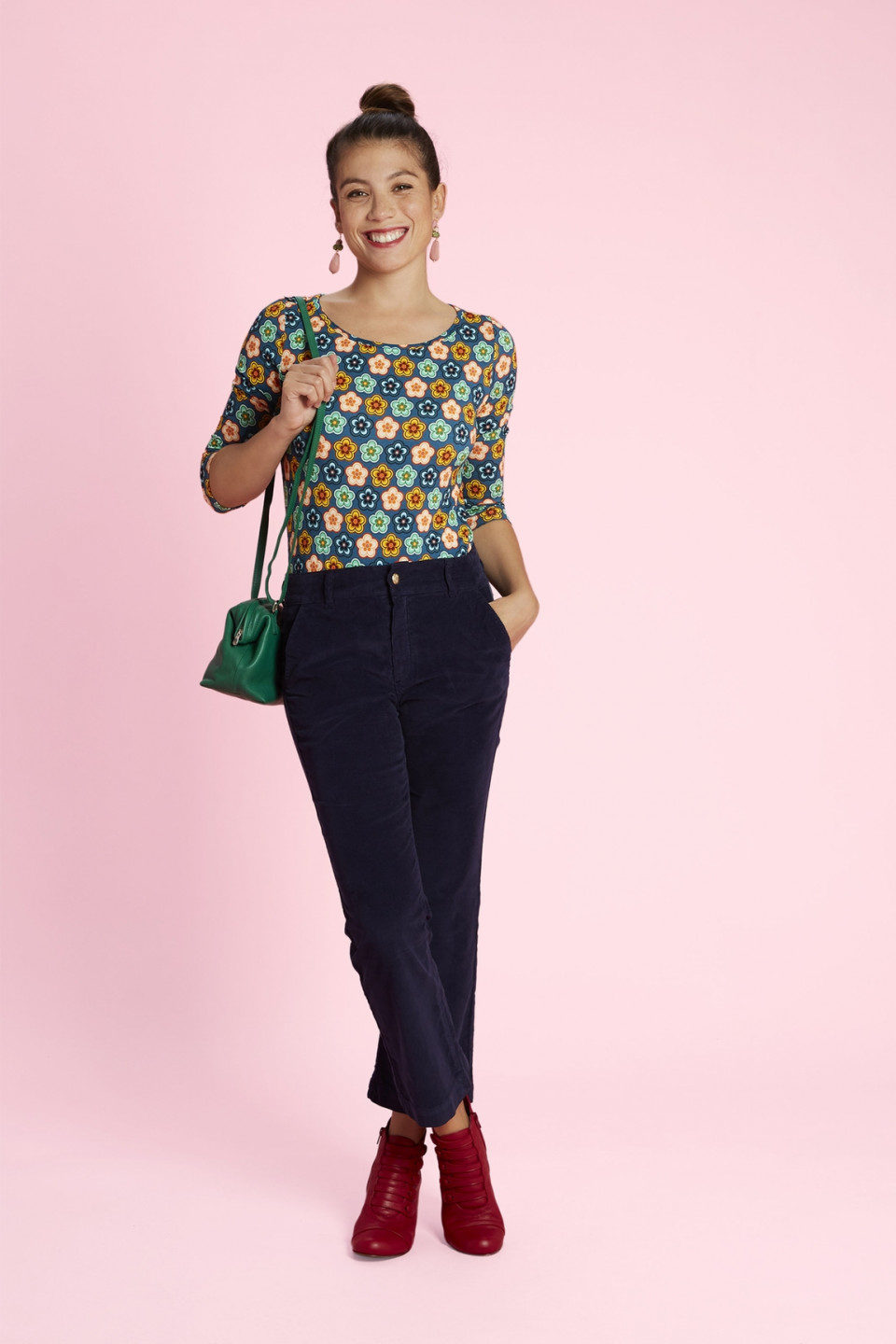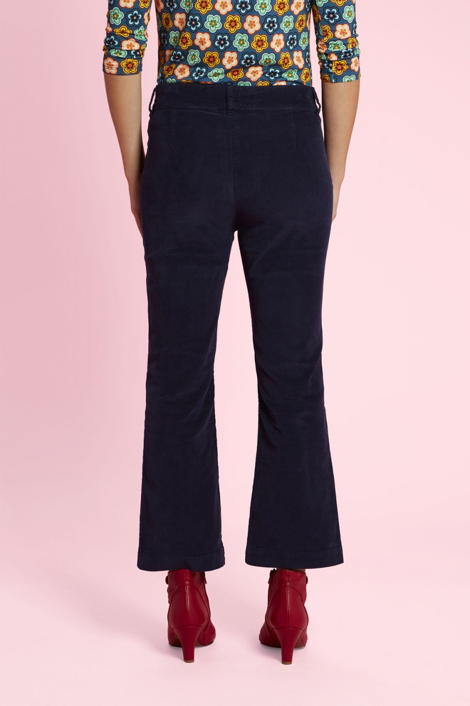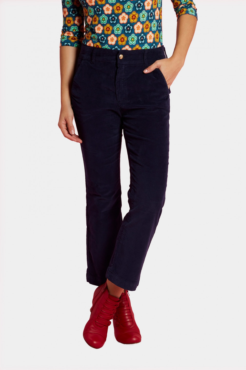Optez pour la douceur avec notre pantalon velours Kate. Sa coupe 3/4 découvrira vos chevilles tout en élégance. Le pantalon se ferme avec un joli bouton doré et possède deux poches sur le devant.