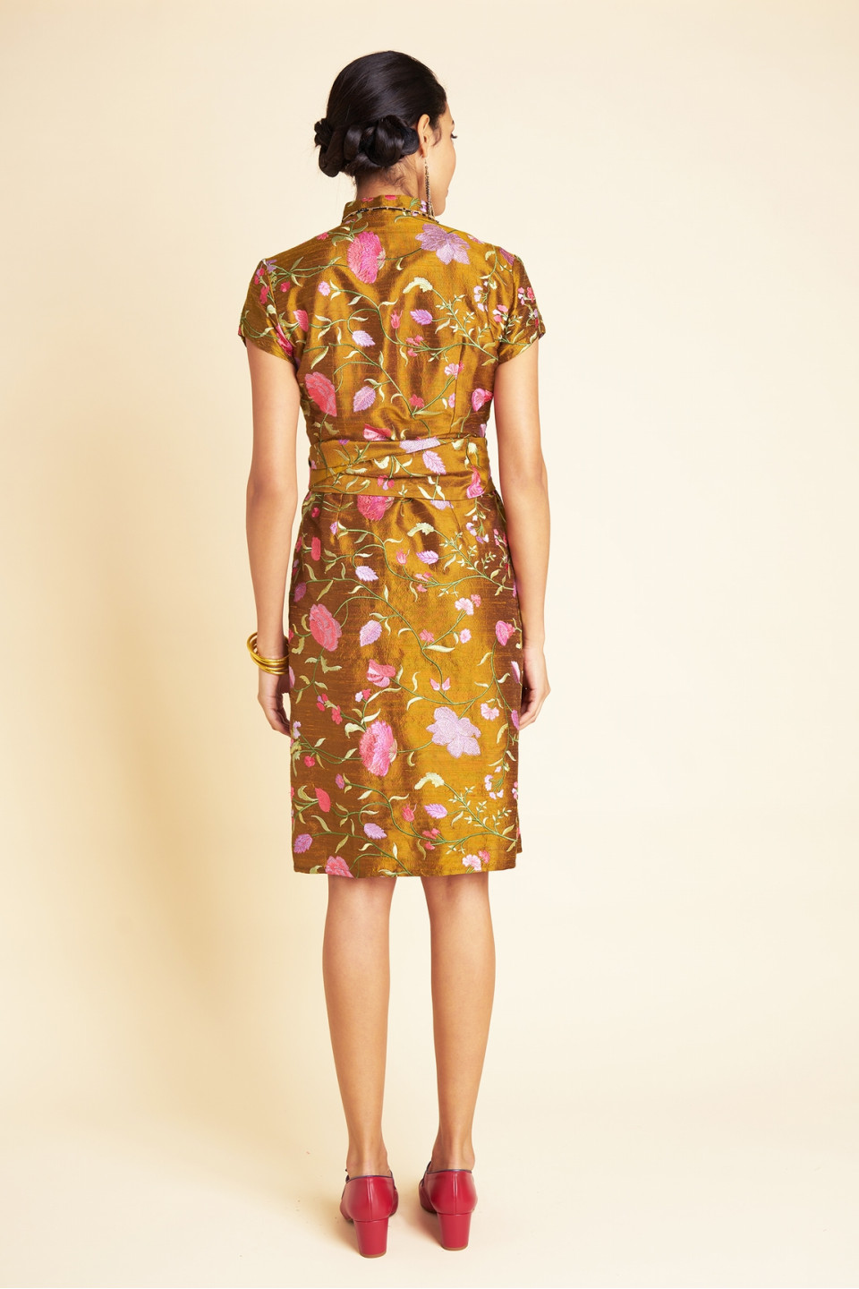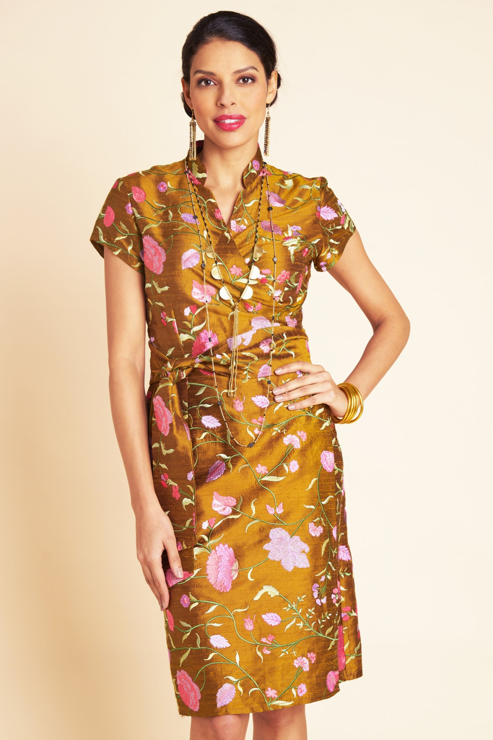 Laissez-vous envoûter par cette robe éblouissante au style traditionnel chinois, confectionnée dans une soie sauvage douce et agréable à porter, sublimée par de délicates fleurs brodées. Son design portefeuille élégant fera de cette robe un choix parfait pour vous accompagner lors d'un événement chic et vous rendre absolument radieuse.