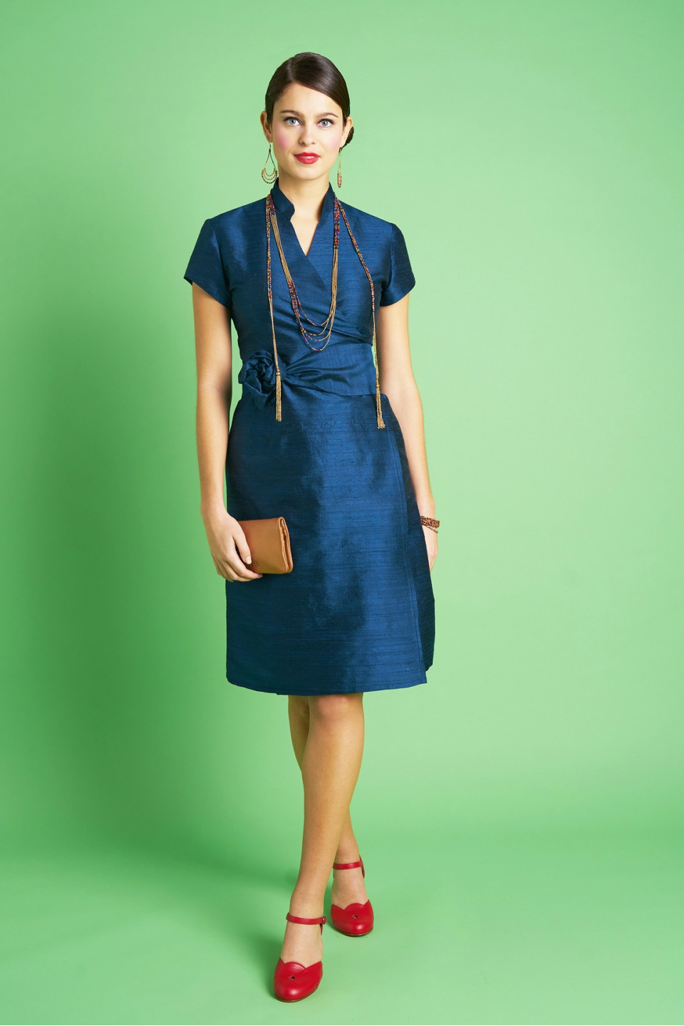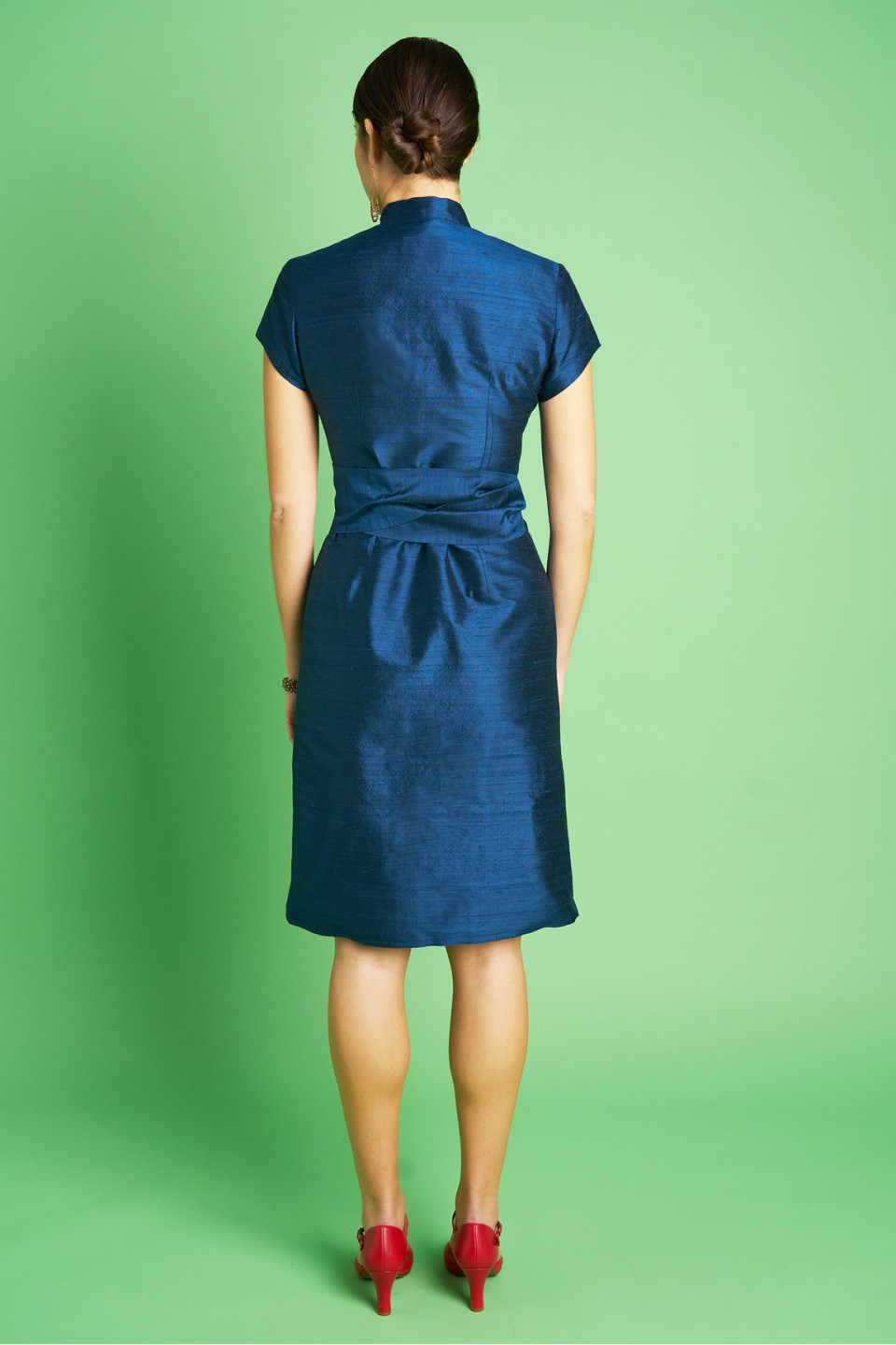 Choisissez cette élégante robe chinoise portefeuille en soie sauvage, avec son col mao et sa large ceinture nouée à la taille.