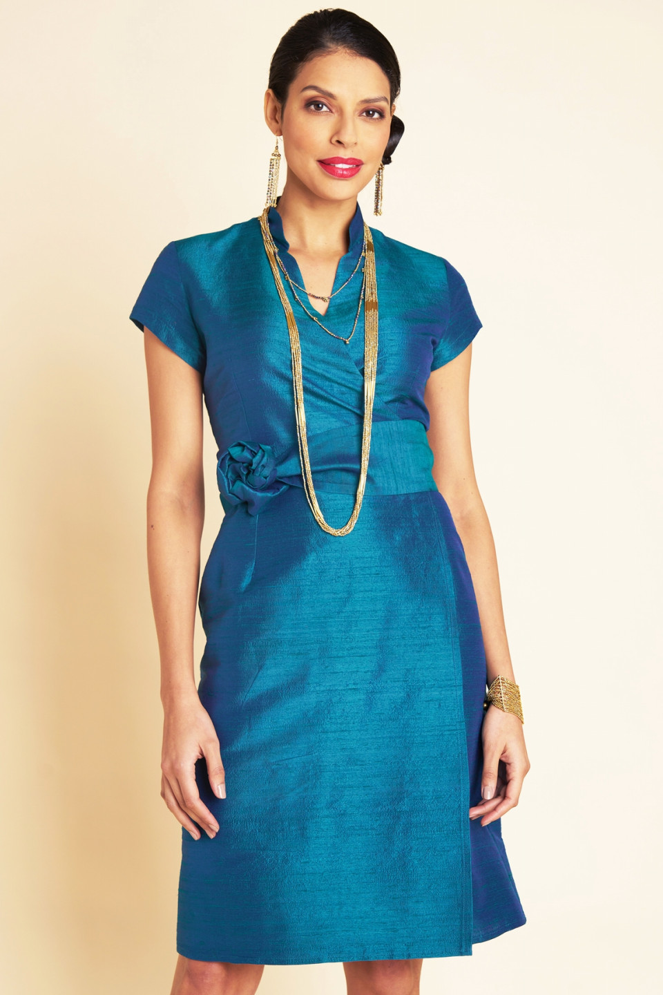 Choisissez cette élégante robe chinoise portefeuille en soie sauvage, avec son col mao et sa large ceinture nouée à la taille.