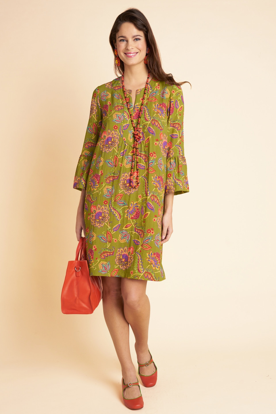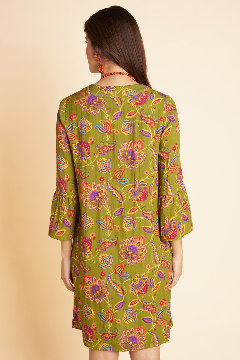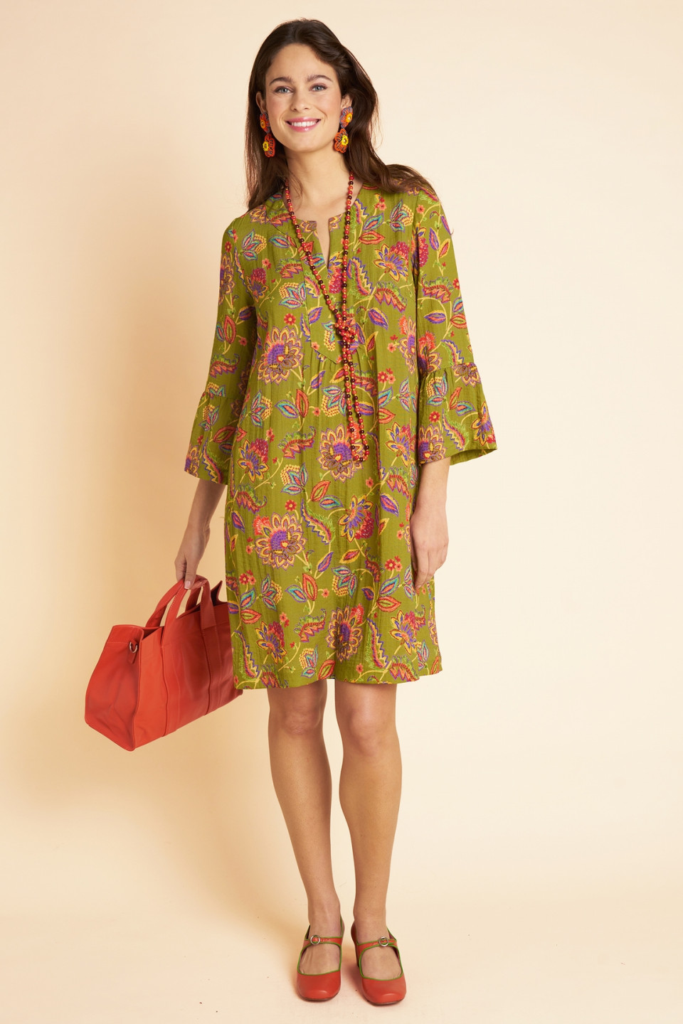 La robe tunique Léa séduit par son allure bohème et ses couleurs lumineuses. Sa coupe fluide, légèrement évasée, accompagne les mouvements avec élégance et assure un confort naturel au quotidien. Les manches trois-quarts légèrement évasées ajoutent de la légèreté à la silhouette et renforcent son style décontracté chic. Confectionnée dans un tissu léger aux nuances vertes chaleureuses, la robe est sublimée par un imprimé floral multicolore qui lui donne un caractère vibrant et plein de charme.