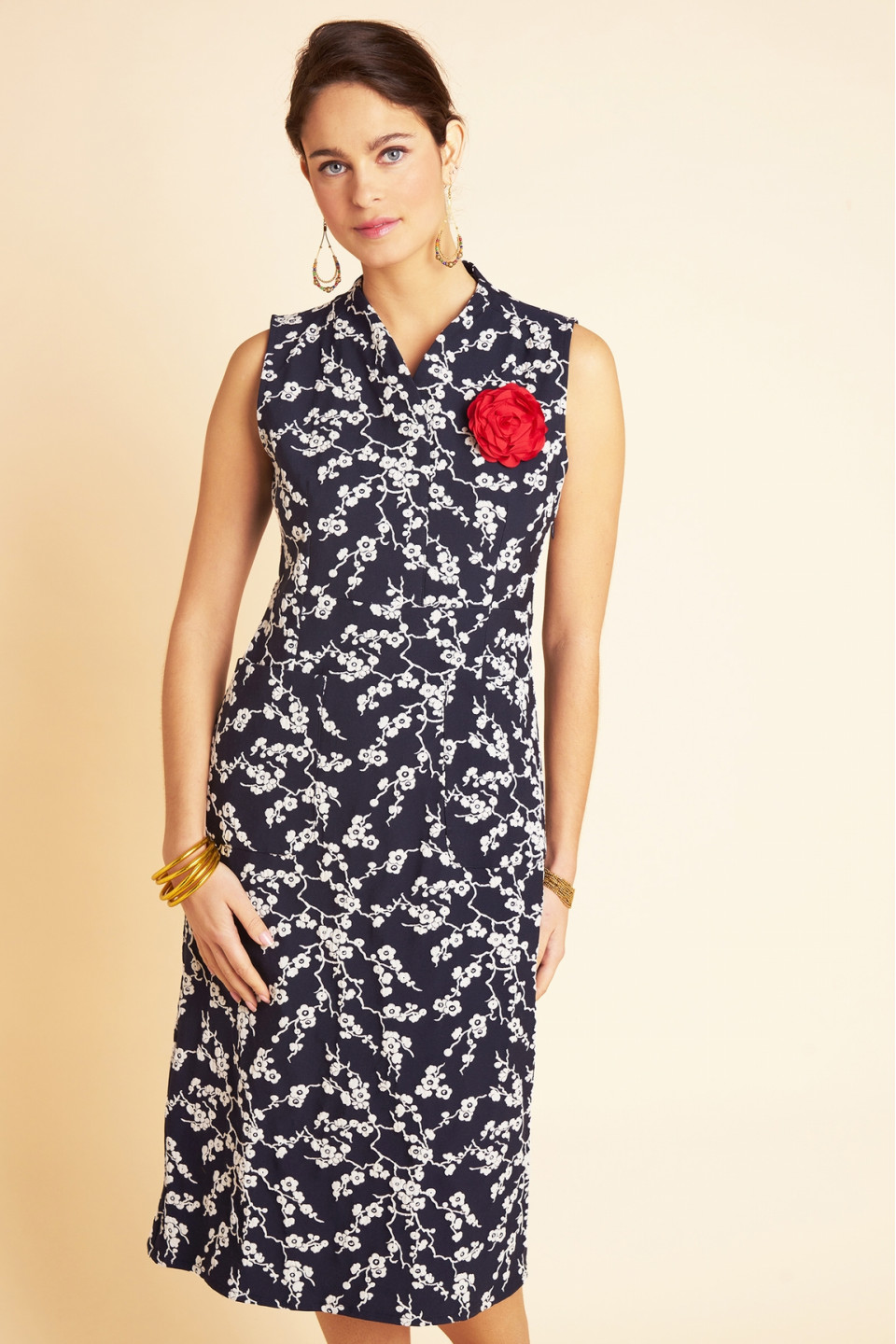La robe Sakura incarne l’élégance avec une sophistication discrète. Sans manches et légèrement cintrée, elle élance délicatement la silhouette. Le col en V, formé par la superposition des tissus, apporte une touche raffinée et originale. Deux poches ouvertes sur le devant allient praticité et style, soulignant le côté fonctionnel de la pièce. Confectionnée dans un tissu bleu profond, elle est sublimée par des motifs floraux blancs en léger relief, rappelant la délicatesse des fleurs de cerisier.