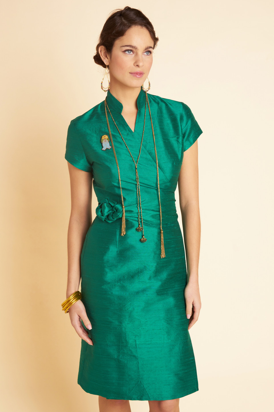 Choisissez cette élégante robe chinoise portefeuille en soie sauvage, avec son col mao et sa large ceinture nouée à la taille.