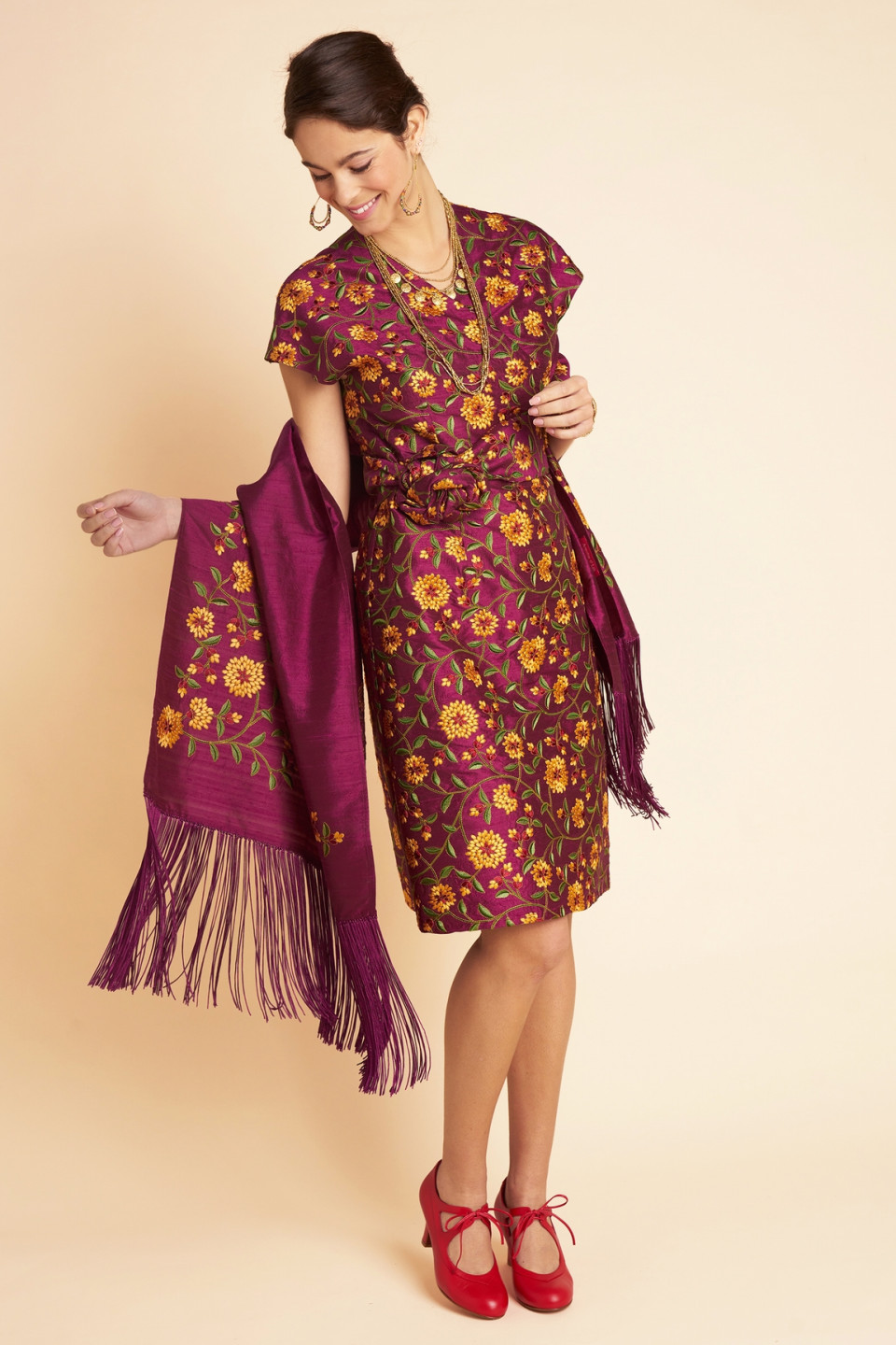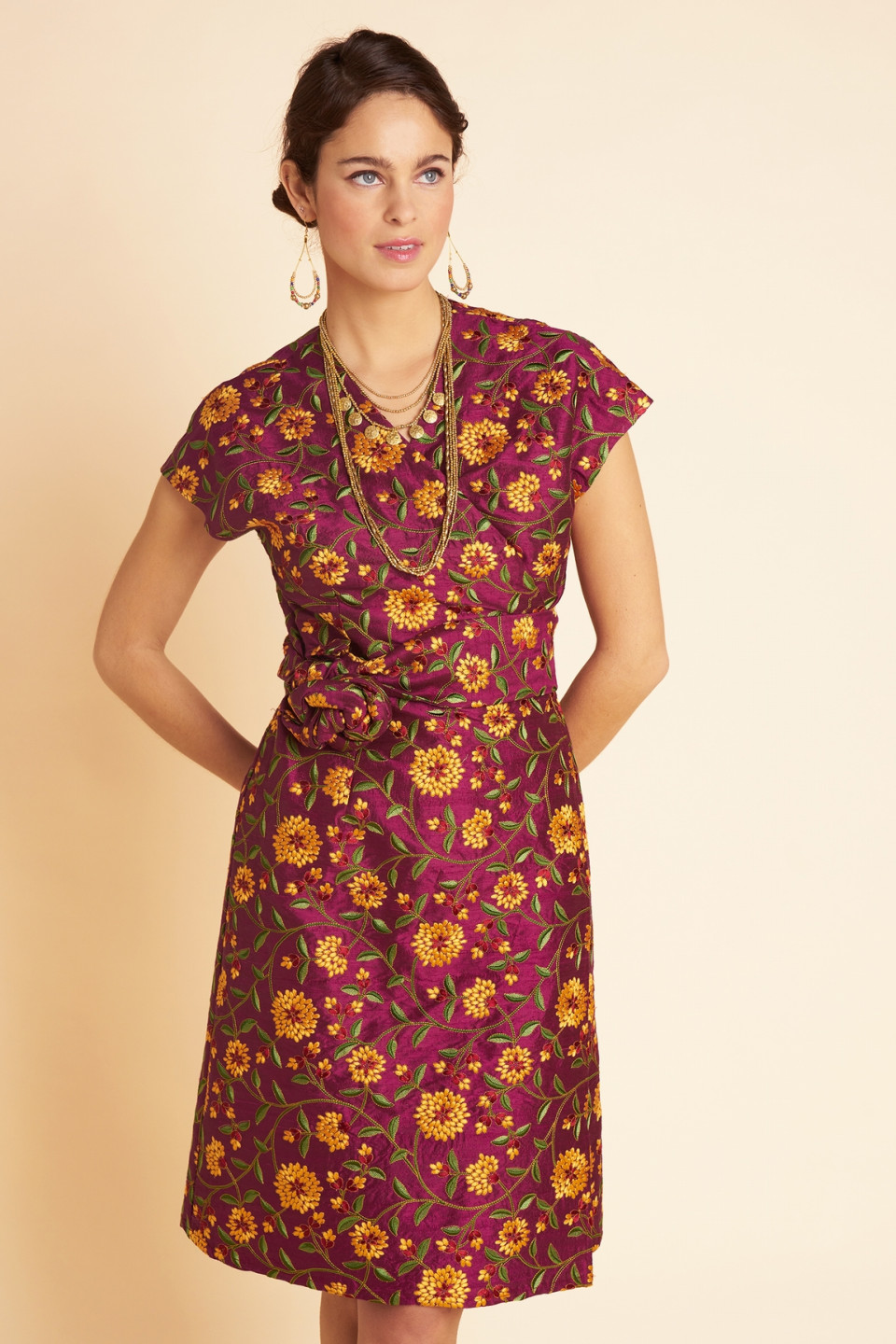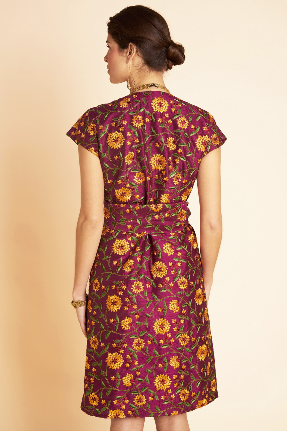 Succombez au charme traditionnel de cette robe portefeuille en soie sauvage, ornée de fleurs brodées jaunes et oranges sur un fond bordeaux profond. Sa coupe élégante, ses manches courtes et sa ceinture ajustable soulignent la silhouette avec finesse. Parfaite pour vos occasions spéciales, elle s’accompagne idéalement d’une étole assortie ou de bijoux dorés.
