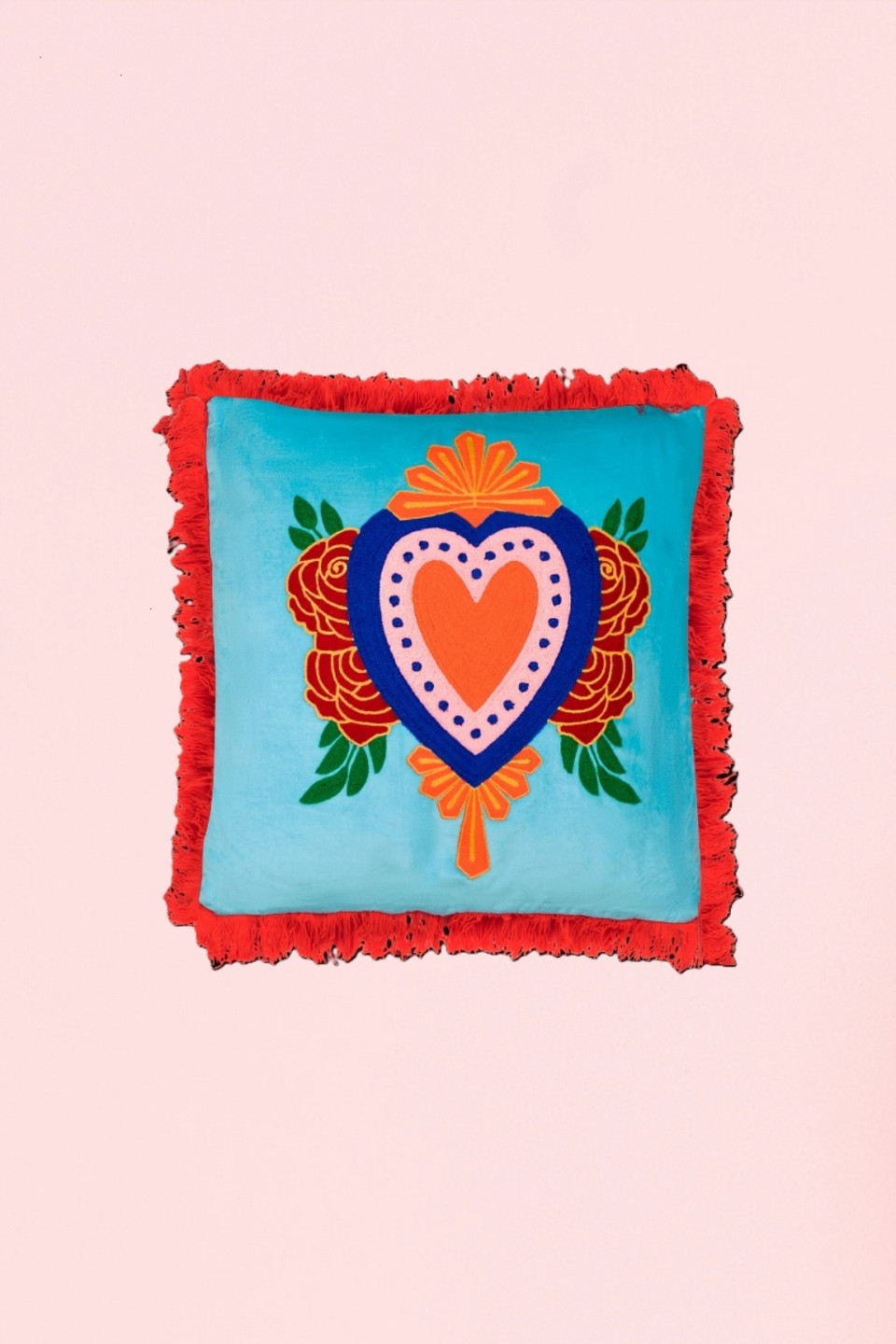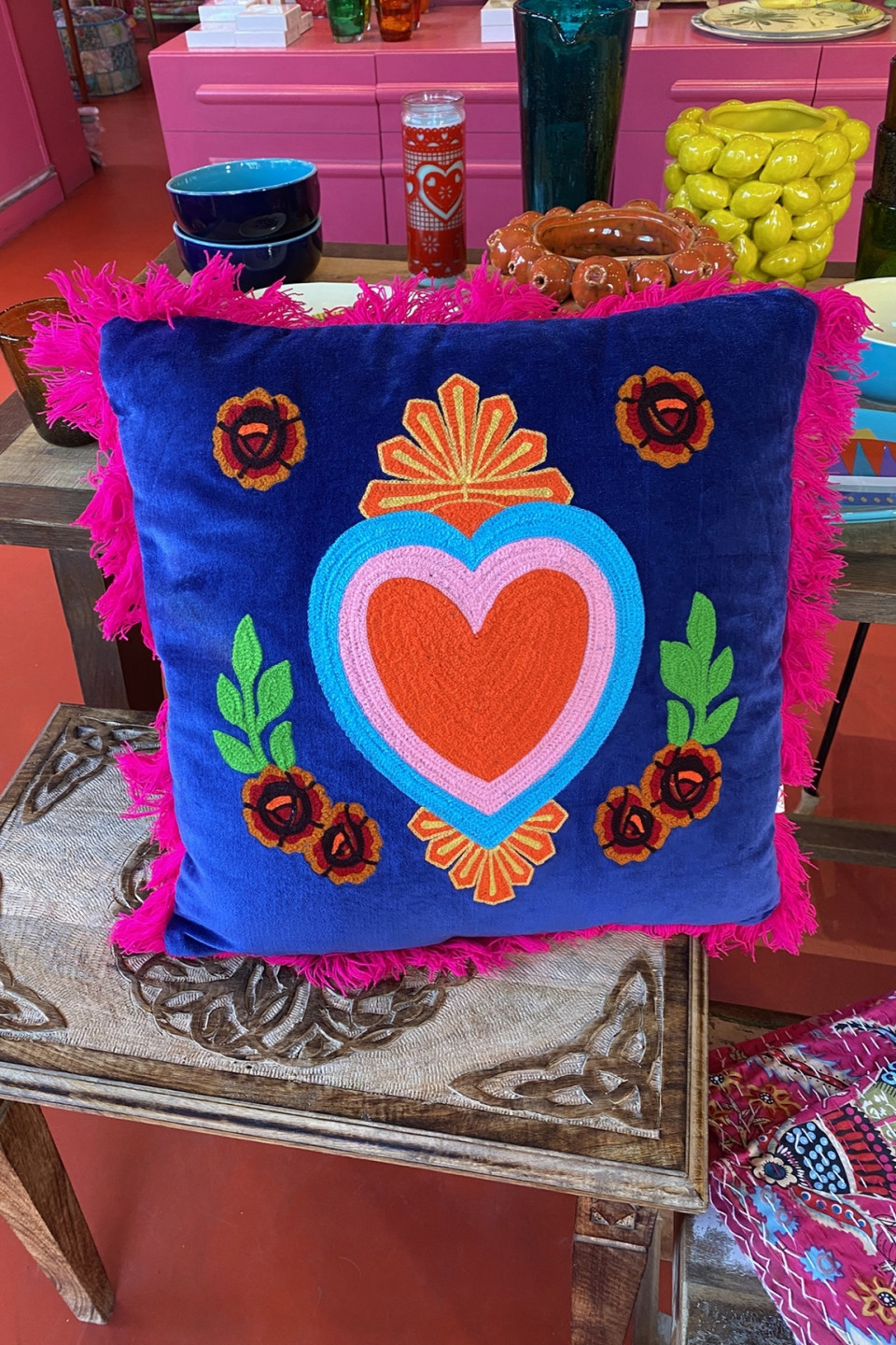 Ce coussin décoratif en velours avec franges est orné d'un cœur brodé et s'inspire du cœur mexicain Milagros.