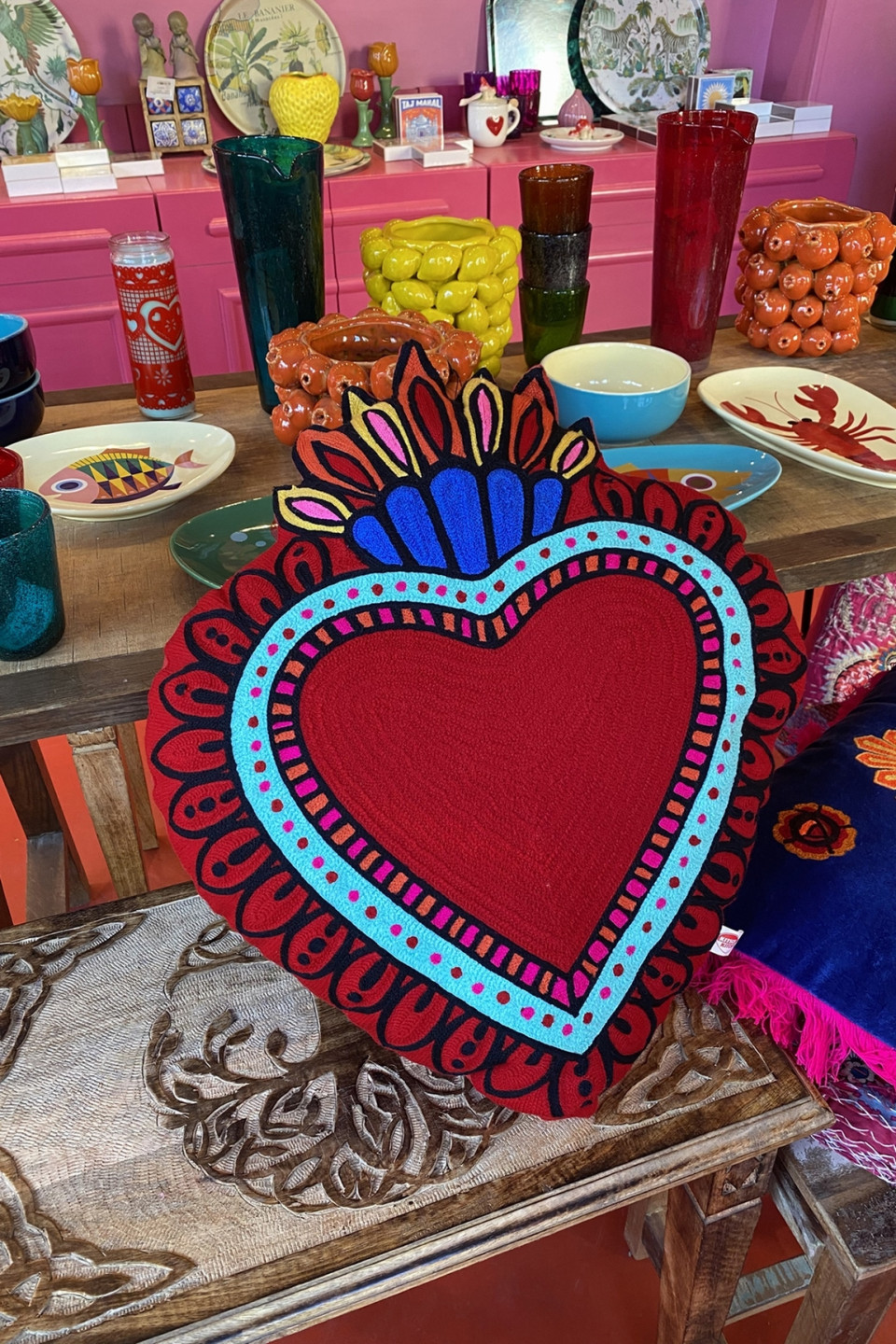 Coussin d’inspiration mexicaine en forme de cœur.