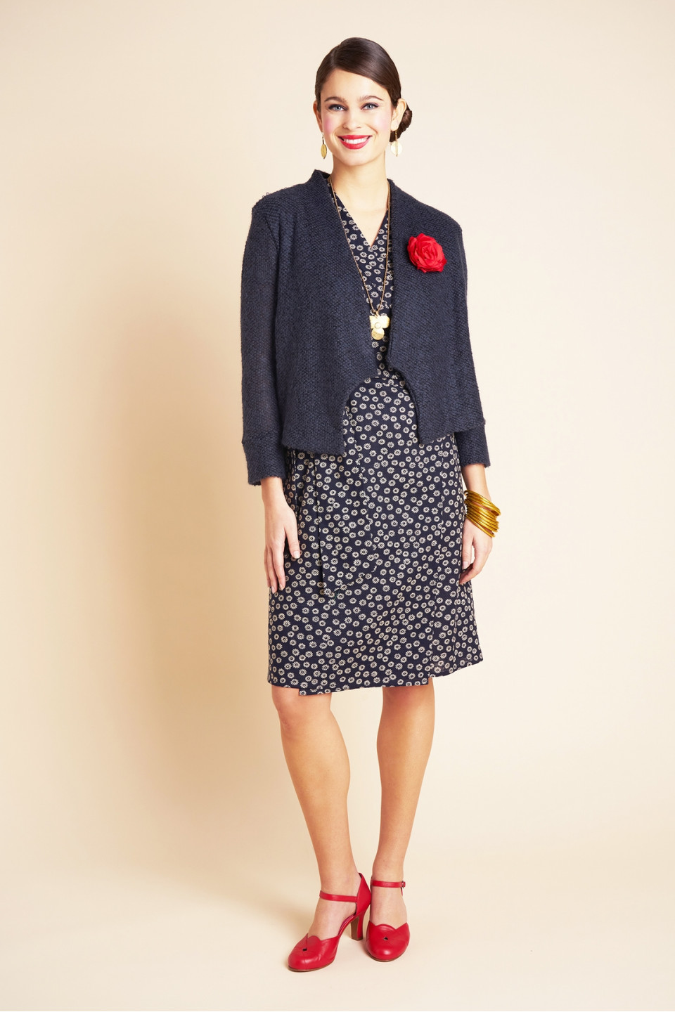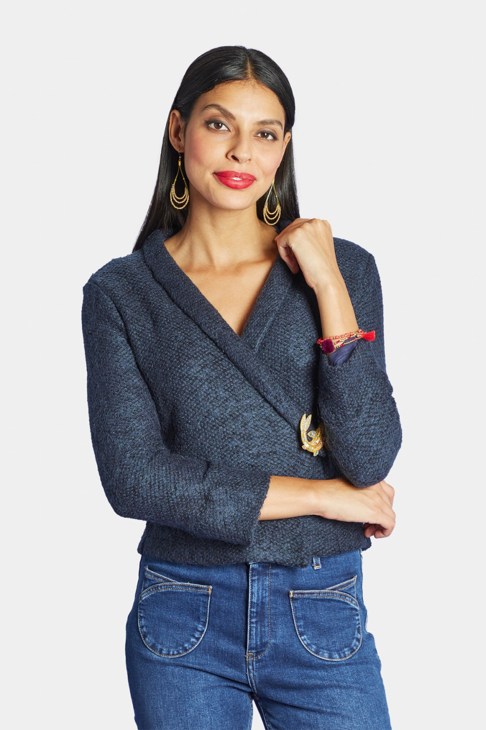 Essayez cette jolie veste courte en laine et mohair ! Col châle et manches longues.